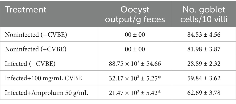 Methods: The study involved the examination of five groups of mice, with E. papillate sporulation oocysts (1 × 103) being utilized to infect three groups by experimental means. The first group was the control, the second group was administered at a dosage of 100 mg/kg of CVBE only to test toxicity, and the third was the infected positive control. The fourth group was treated daily with 100 mg/kg of CVBE, while the fifth group received 50 mg/kg of amprolium via gavage. All mice were sedated using CO₂ and subsequently dissected for sample taking. Results FT-IR analysis, conducted using a Thermo Scientific optical spectrometer, revealed that CVBE contains 18 different phytochemical components. The administration of CVBE led to a significant decrease in the number of oocysts produced in the feces. Additionally, the parasite stages exhibited morphometric changes, with decreases in the measures compared with those of the infected but not treated mice. This improvement was accompanied by large increases in the number of goblet cells, which provided additional support for the effectiveness of CVBE as anticoccidial agents.