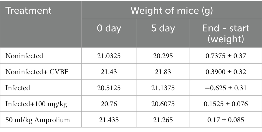 Compared with that in the control group, E. papilate parasite infection led to a decrease in weight in the infected group, whereas the weight in the treated groups showed minimal negative or positive effects (Table 4).