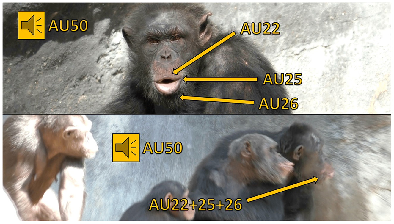 Figure 1. This figure features a chimpanzee named Ben producing pant hoots, identifiable by the presence of AUs 22+25+26+50 (i.e., the lips are funneled, lips parted, and jaw dropped, all accompanied by a vocalization). Pant hoot calls are generated during periods of high excitement, such as responses to observing playful interactions, distress, or the availability of food (51). In this scenario, Ben produces a pant hoot facial signal and vocalizes in response to another chimpanzee's scream, causing the surrounding chimpanzees to heighten their vigilance and attend to the situation. In the top image, Ben's face is clearly visible as he sits still, devoid of any other chimpanzees or objects that could obscure his facial muscle movements. Conversely, the bottom image presents challenges for FACS coding: Ben's face (on the right) is partially obscured by other chimpanzees, and he is in motion, moving quickly from left to right. Additionally, the profile view in the video clip complicates the discernment of his facial muscle movements compared to a head-on perspective.