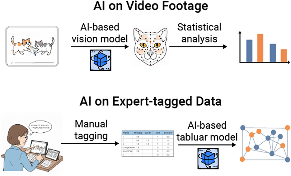 Figure 2. This figure illustrates two primary ways in which both manual and AI-powered approaches can be integrated. The first method involves implementing AI-based vision models on video footage collected by animal behaviorists. These models are used to identify and quantify various variables, such as the distance between animals and the presence/absence of facial muscle movements. The second method involves applying AI-based tabular models to pre-existing datasets that have been manually coded, allowing researchers to explore novel questions. For instance, this may include identifying patterns in communication variables or determining whether instances of rapid facial mimicry are occurring.