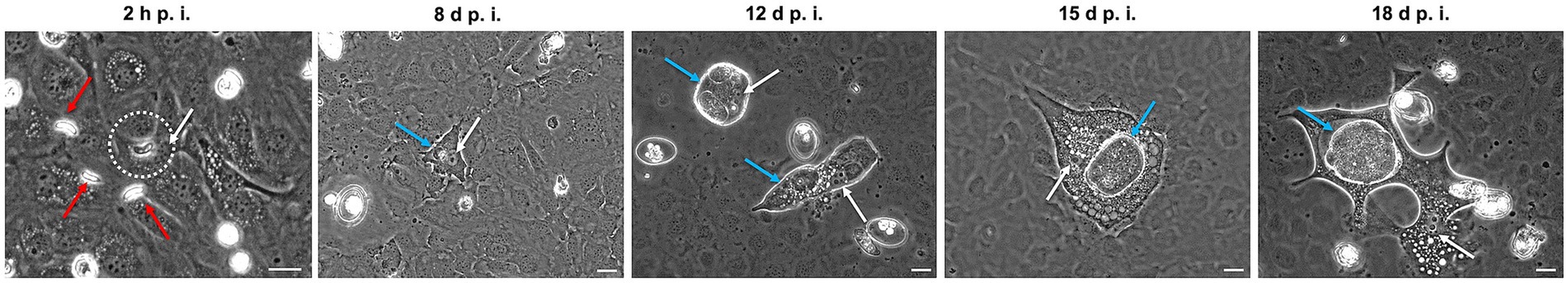 Figure 1. Development of Eimeria christenseni immature macromeronts in BUVEC, 8–18 days post infection (d p. i.). E. christenseni sporozoites were observed intracellularly as soon as 2 h p. i. (white circle), while others remained extracellularly (red arrows). From 8 d p. i. nuclei of infected BUVEC presented “fried-egg” shape (white arrows) like other ruminant endothelial Eimeria spp. infections. At 8 d p. i., a small immature meront (blue arrow) is observed very close to the host cell nucleus. Meronts presented different phenotypes (rounded or elongated) (12 d p. i., blue arrows) sometimes with multiple chambers (12 d p. i.) or presenting a single chamber (15 and 18 d p. i., blue arrow). Scale bar 20 μm.