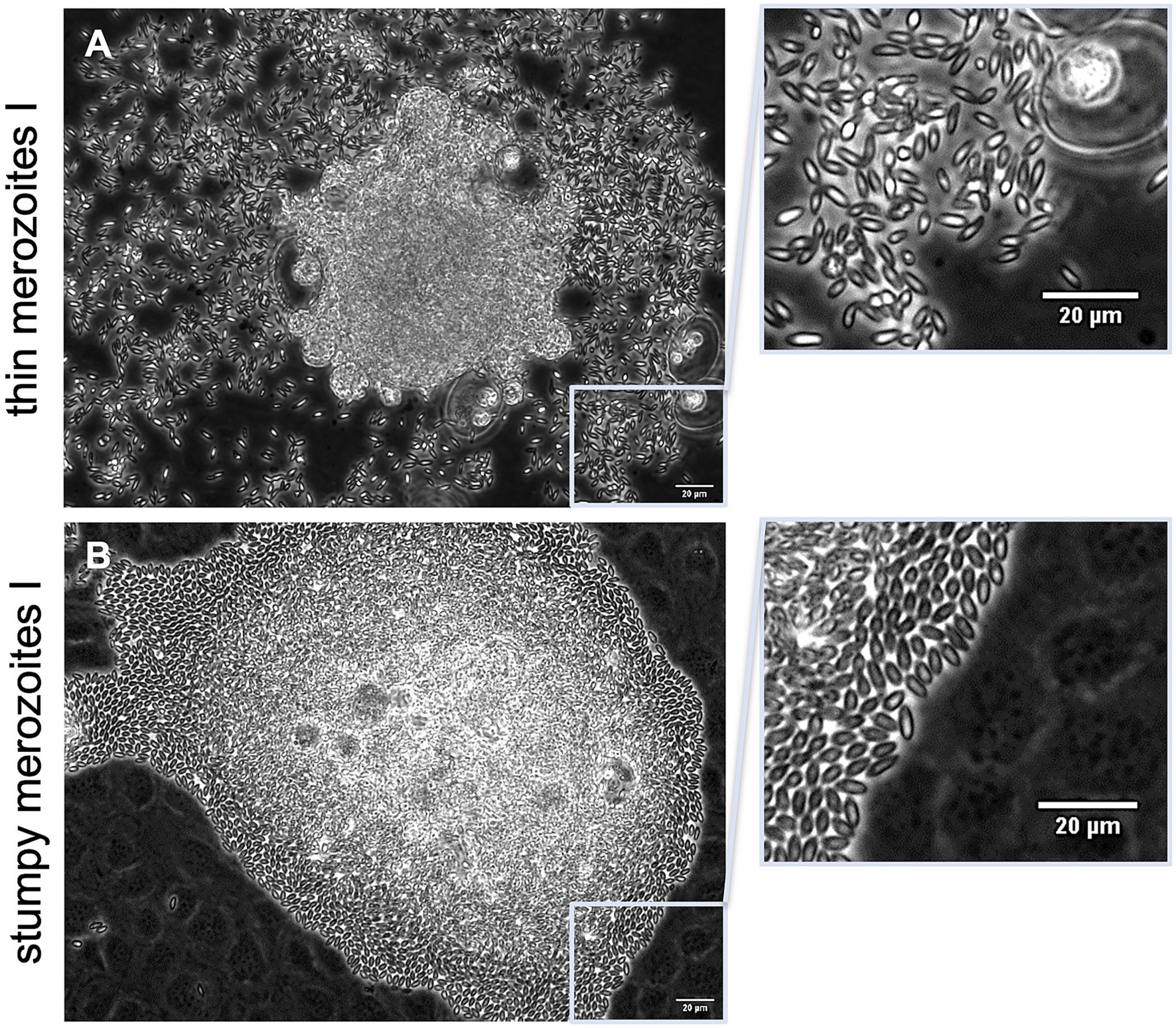 Microscopic images showing two types of parasite merozoites. Image A: Thin merozoites form a cluster with details highlighted in a magnified section. Image B: Stumpy merozoites form a dense cluster, also with a highlighted magnification. Both magnified sections have a scale bar of twenty micrometers.