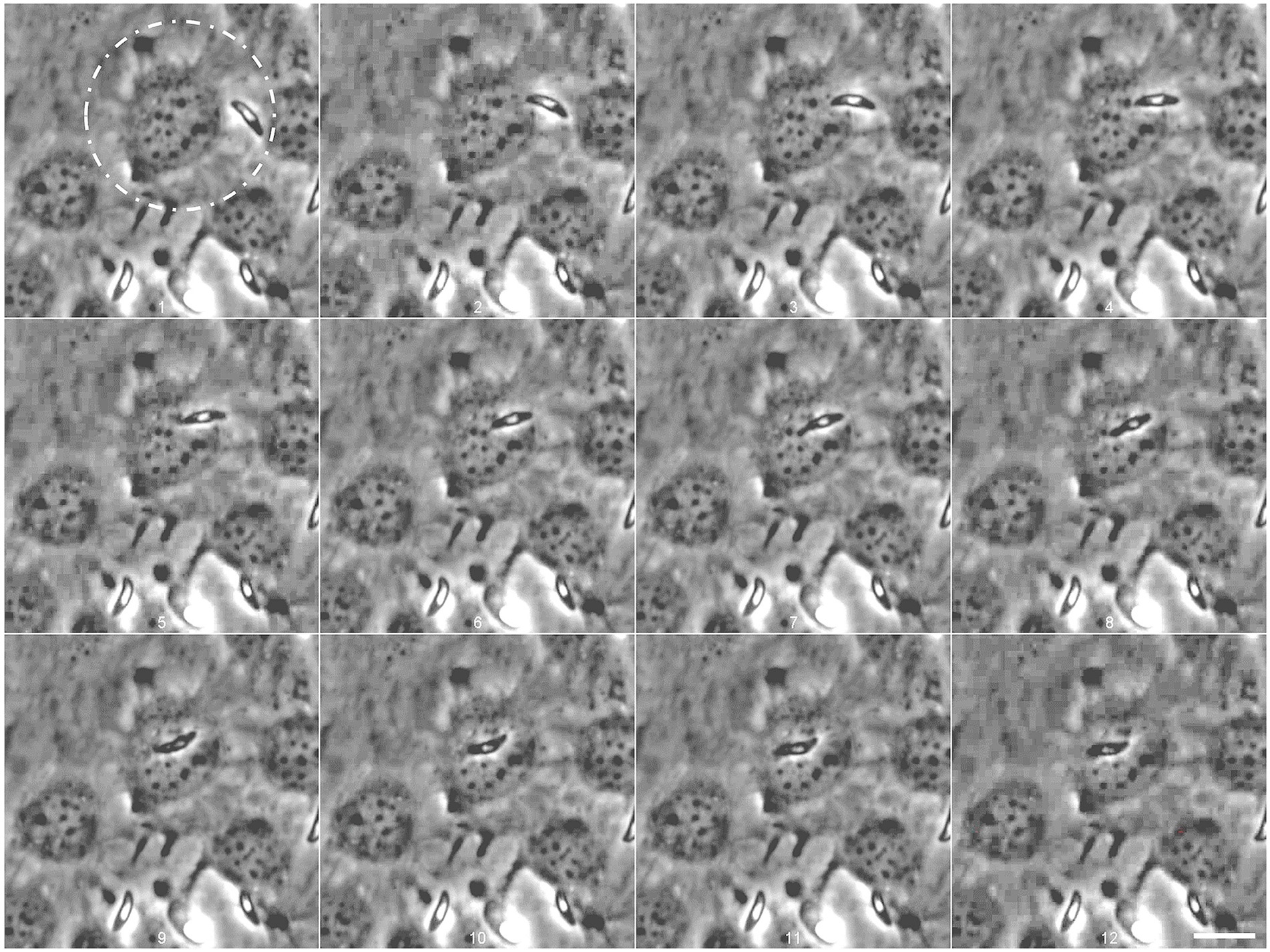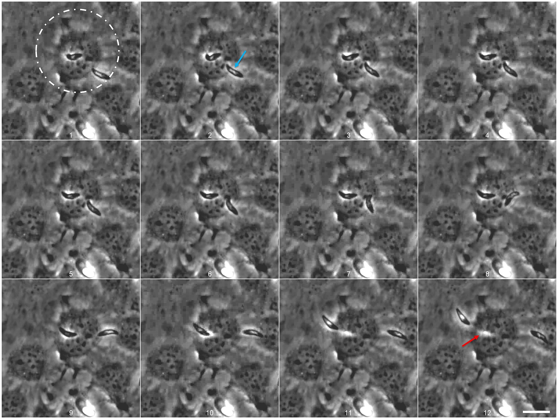 Figure 3. Eimeria christenseni merozoites I actively invaded BUVEC shortly after release from the macromeront (white circle). Motile merozoites I approached BUVEC close to the nucleus (1–2) and started active invasion (3) that was completed within 6 s (2–9). The merozoite I remained intracellularly after minor adjustments (9–12) for over 12 min. Images were acquired every 750 ms. Scale bar 20 μm.