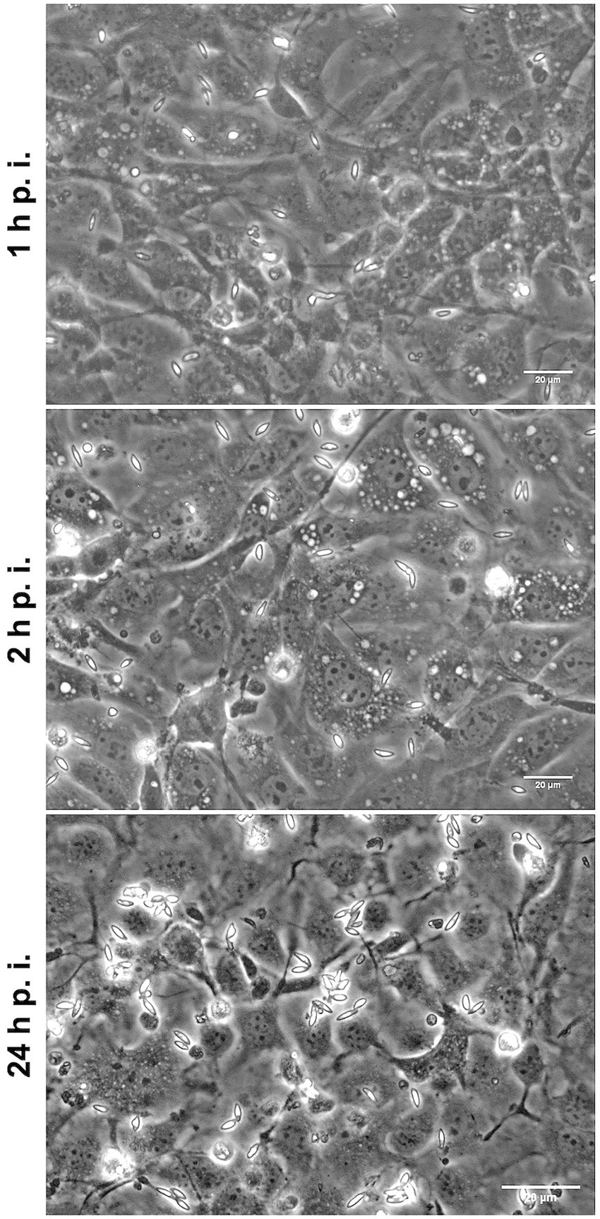 To better understand if E. christenseni merozoite I breaching ability was also possible in naïve BUVEC, i.e., without previous contact to E. christenseni stages (sporozoites, sporocysts, oocysts, oocyst circumplasm), merozoites I were collected, washed and, thereafter, seeded in these naïve BUVEC monolayers. After 1 h and 2 h of exposure, no merozoites I were found intracellularly (Figure 5). Most parasites remained viable and presented typical gliding motility being fairly distributed on the monolayer. At 24 h p. i., some merozoites I were still active and vital but others (40%–50%) were observed darker, started to round up and were immotile (Figure 5, 24 h p. i.). No infected/invaded cells were ever observed, indicating that such behaviour might be dependent on paracrine effects derived from other E. christenseni-infected host cells. The same results were obtained in three independent assays, proving that this phenomenon was independent of host and individual donor variations, but rather dependent on the inability of these parasite stages to invade naïve host cells.