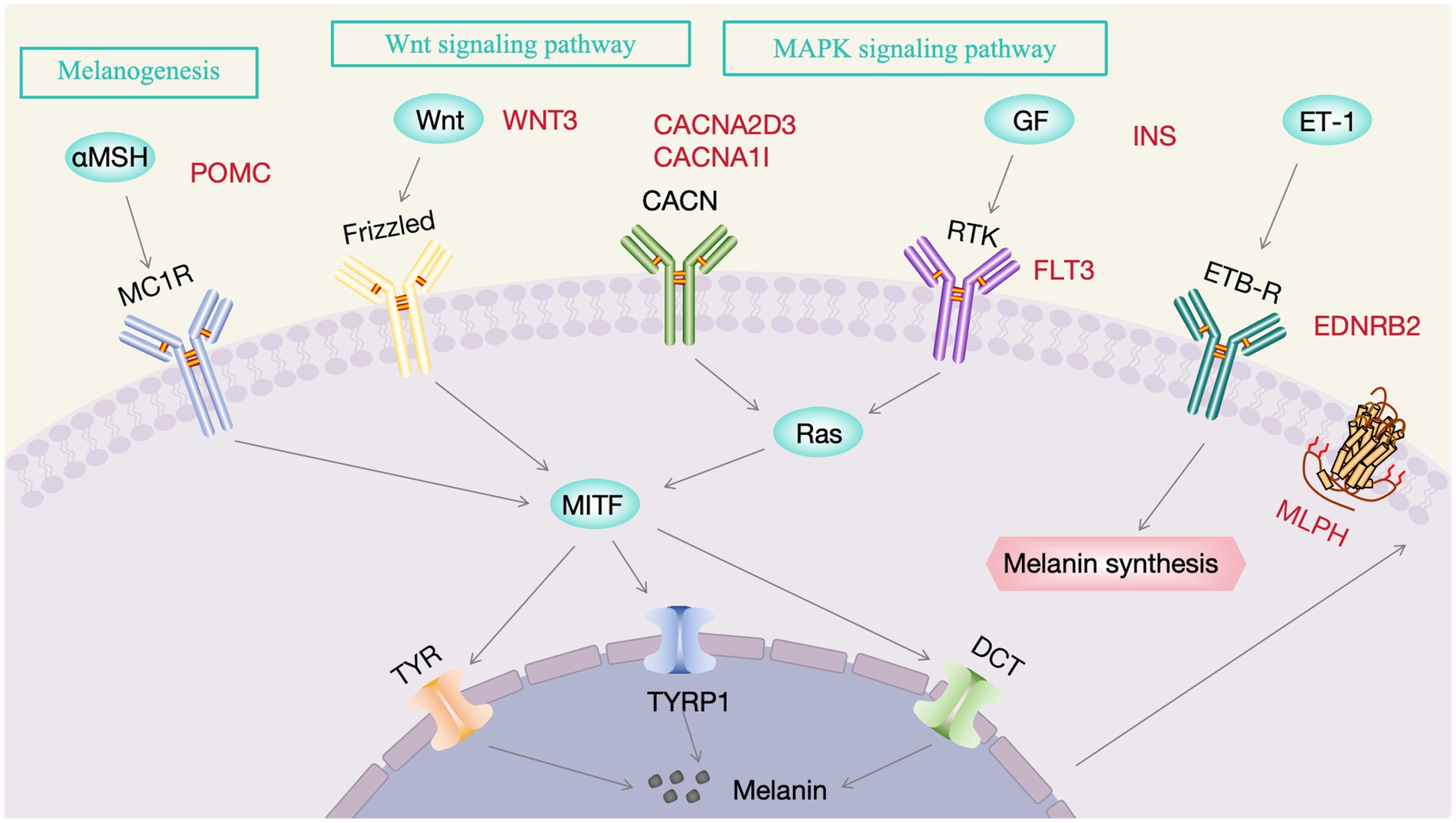 Enrichment analyses were performed to elucidate DEG functions. KEGG pathway analysis revealed that the DEGs EDNRB2, WNT3, POMC, INS, FLT3, CACNA2D3, and CACNA1I were involved in melanogenesis and MAPK and Wnt signaling, all of which are known to be interconnected with each other. Melanogenesis is a complex biosynthetic process in melanocytes that leads to the production of melanin pigments through a series of enzymatic and chemically catalyzed reactions (37). EDNRB2 and POMC both showed enrichment in the melanogenesis pathway, and their involvement in melanin production is well-documented. POMC is mainly secreted in the hypothalamus and acts as a precursor polypeptide hormone and is associated with the morphological differentiation and the production of melanin in B16-F10 melanoma cells (38, 39). Moreover, POMC is converted into hormones derived from it, including ACTH and α-MSH (39). α-MSH increases peroxide levels in melanocytes to stimulate the synthesis of melanin (40). MITF is a melanocyte-specific transcription factor that can directly bind and activate the tyrosinase promoter, upregulating tyrosinase levels and promoting melanin production (41). The Wnt axis is known to regulate MITF expression (42). This involves Wnt binding to the G-protein coupled receptor Frizzled, inactivating GSK3β and ultimately resulting in β-catenin accumulation (43–46). This β-catenin undergoes nuclear translocation where it binds to Lef-TCF, thereby increasing MITF expression and stimulating melanin synthesis (47, 48). Wnt3 is part of a group of approximately 20 ligands involved in the Wnt axis, influencing cell proliferation and differentiation (49). Therefore, we speculate that WNT3 may promote the proliferation of melanocytes through the WNT signaling pathway. In addition, an interaction between Wnt3 and FGF16 was found when comparing the C and T groups. FGF family proteins are typically involved in cell proliferation, differentiation, and survival, and it is thus suggested that an interaction between Wnt3 and FGF16 may promote proliferation (50). The MEK and ERK kinases associated with the MAPK axis are known to activate melanocyte receptors (51). Ligands bind to the extracellular domain of the receptor, activating a cascade (Ras–Raf–MEK–ERK) that leads to the upregulation of MITF (51). P38 phosphorylation induces MITF expression, in turin upregulating proteins associated with melanin production and thus melanin synthesis (52). The INS gene encodes insulin, which activates the insulin signaling pathway during the process of cell differentiation, thereby promoting cell maturation (53). FLT3 is a type III receptor tyrosine kinase, and its ligand can induce dimerization and activate its intrinsic tyrosine kinase activity, leading to autophosphorylation and the initiation of several signaling cascades, including the MAPK signaling pathway (54, 55). CACNA2D3 and CACNA1I are both gene families associated with calcium channels that play key roles in the regulation of intracellular calcium ion concentration, influencing cell proliferation and differentiation by affecting the MAPK signaling pathway (56). Thus, we speculate that these DEGs are involved in melanin production, although the precise genetic process requires further research.