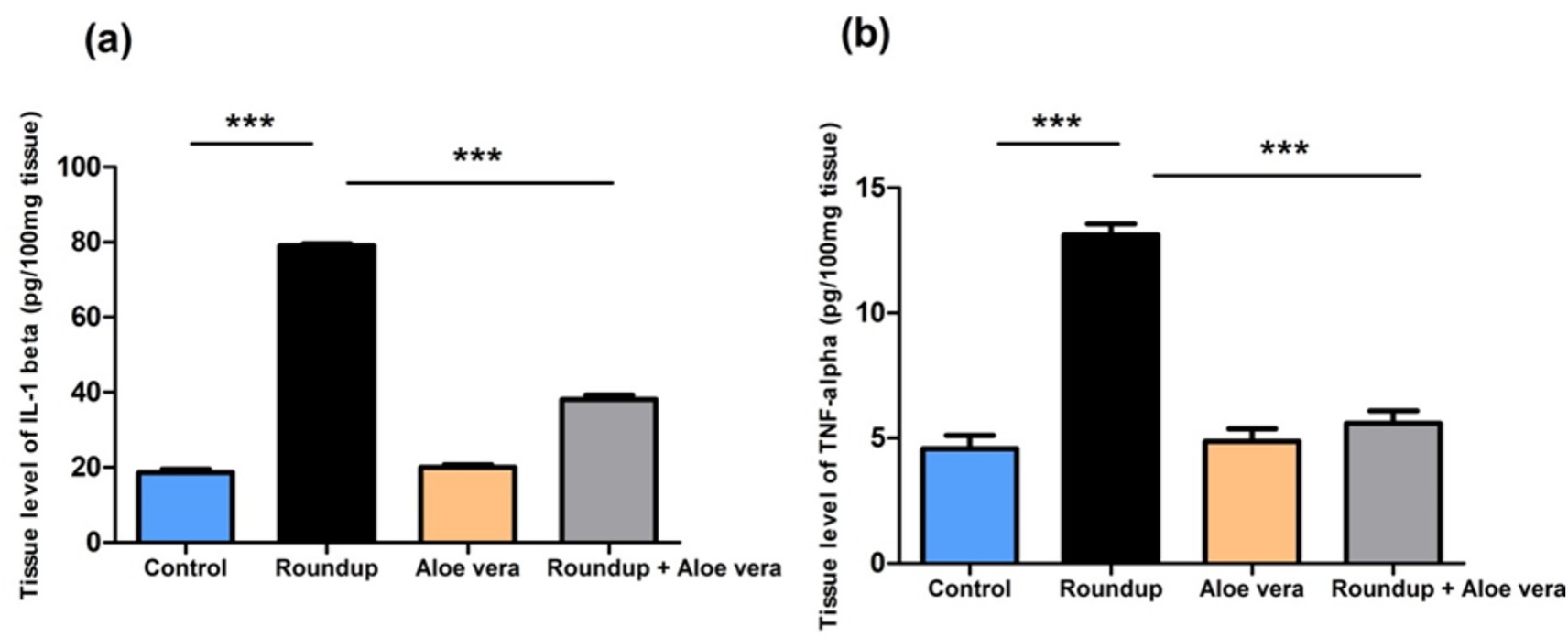 Figure 2. Effect of co-administration of Roundup and Aloe Vera on hepatic IL-1β and TNF-α. (a) IL-1β and (b) TNF-α levels showing a significant decrease in the Roundup + Aloe Vera-treated rats in comparison with the Roundup-exposed rats. ***p < 0.001.