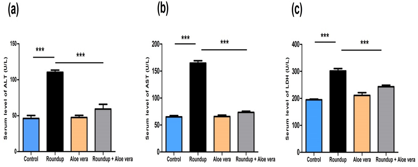 Figure 3. Effect of co-administration of Roundup and Aloe Vera on liver function enzymes. Serum levels of (a) ALT, (b) AST, and (c) LDH showing significant down-regulation in the Roundup + Aloe Vera-treated rats compared to the Roundup-exposed rats. ***p < 0.001.