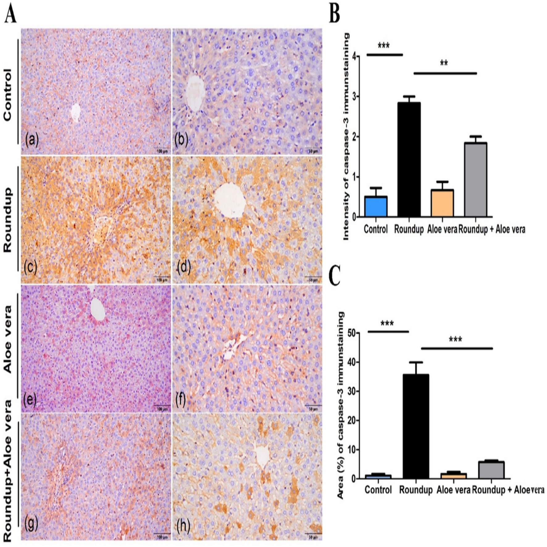 Figure 6. Immunohistochemical analysis of caspase-3 in hepatic tissues. (A) Immunoexpression of caspase-3 in Control, Roundup, Aloe Vera, and Roundup + Aloe Vera. (B) Intensity of the immunostaining of caspase-3. (C) Area percentage of caspase-3 immunostaining from the total number of pixels. **p < 0.01, ***p < 0.001.