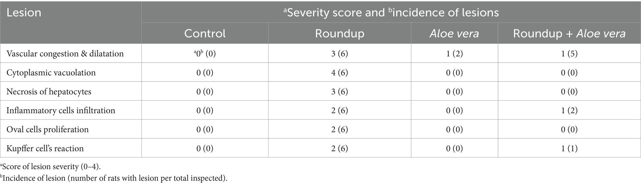 Roundup® is the first choice formulation for weed control thanks to its potency, where it comprises mixtures of glyphosate and adjuvants to enhance the active ingredient uptake and translocation into plant tissues (25). Commercially, Roundup formulated with polyethoxylated tallow amine (POEA) surfactant with the isopropylamine salt (IPS) of glyphosate. POEA surfactant is responsible for the weed-killing ability of glyphosate, where it increases the permeability of glyphosate salt to the plant cells (26–28). Herbicide brands which contain previous surfactants may be more toxic and persistent than glyphosate alone (29, 30). Thus, Roundup has negative effects on various enzymes, which play essential roles in chemicals’ detoxification and metabolism in the liver (31–33). Saleh et al. (34) revealed the Roundup (glyphosate 48%) hebatotoxicity in albino rats through histopathological examination and biochemical analysis. Pandey et al. (35) observed the inflammatory effects of Herbicide Roundup (41% w/w glyphosate) in rat liver. Djaber et al. (36) and Djaber et al. (37) studied the oxidative stress effect and histopathological lesions of Roundup® TURBO, which contain glyphosate active ingredient in rat liver.