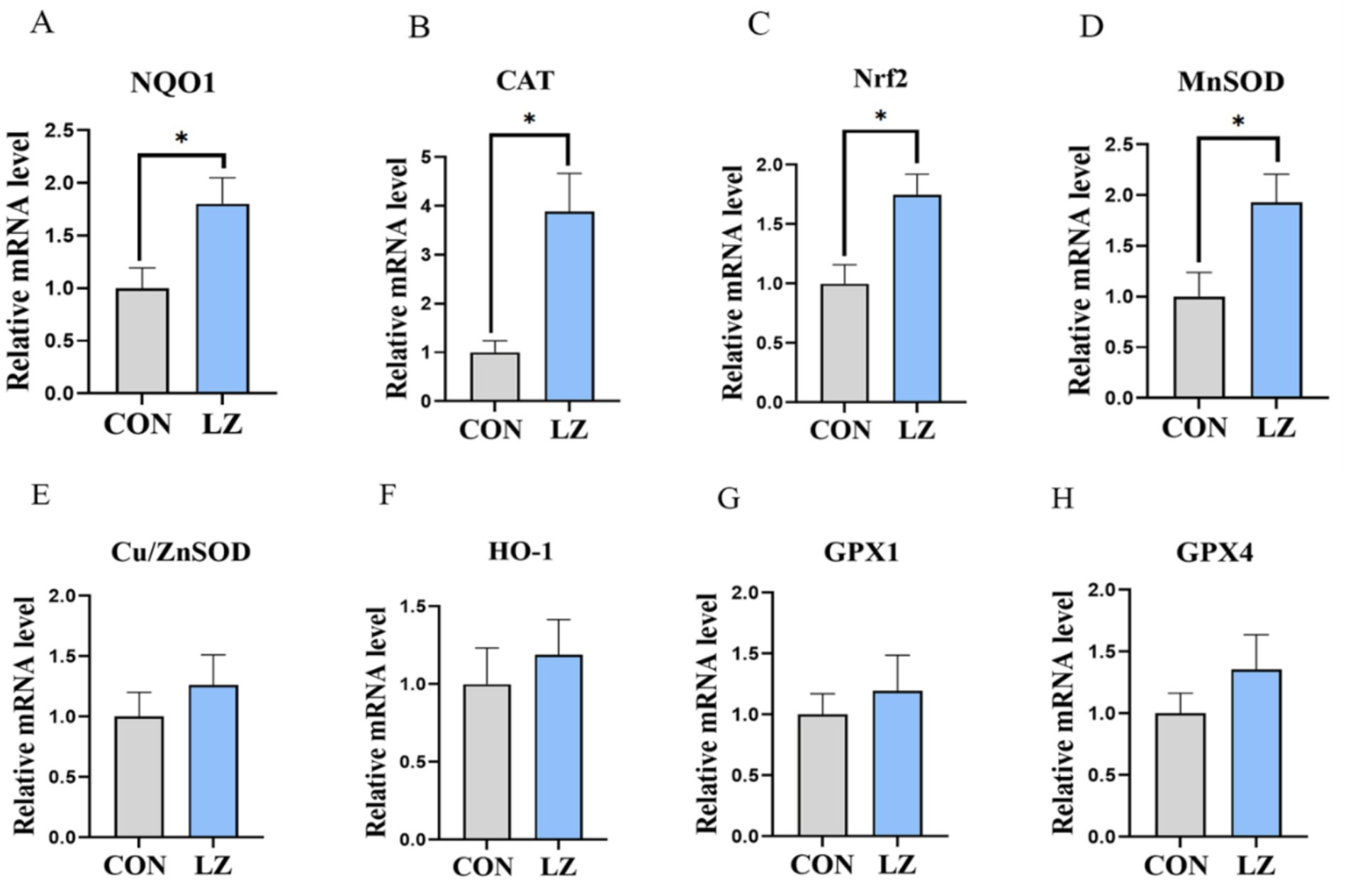 We also evaluated the effects of dietary LZ supplementation on antioxidant capacity of weaned piglets (Figure 2). The results exhibited that the mRNA expression of NADH quinone oxidoreductase 1 (NQO1), nuclear factor E2-related factor 2 (Nrf2), Mn superoxide dismutas (MnSOD), and catalase (CAT) were significantly up-regulated (p < 0.05) of the LZ group compared with the CON group.