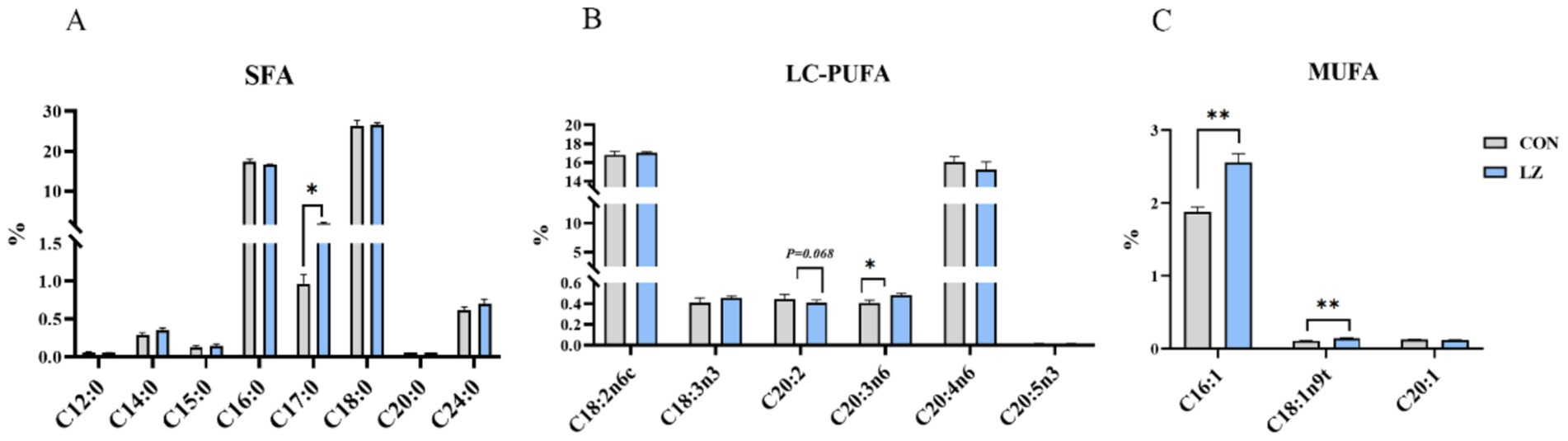 The liver fatty acid profiles of the weaned piglets are shown in Figure 3. Interestingly, it was found that dietary LZ supplementation significantly increased the content of C16:1 fatty acid (p < 0.01), C17:0 fatty acid (p < 0.05), C20:3n6 fatty acid (p < 0.01) and C18:1n9t (p < 0.05) fatty acid in liver. Besides, the results showed that the C20:2 (p = 0.068) content in the liver of weaned piglets from the LZ group tended to decrease.