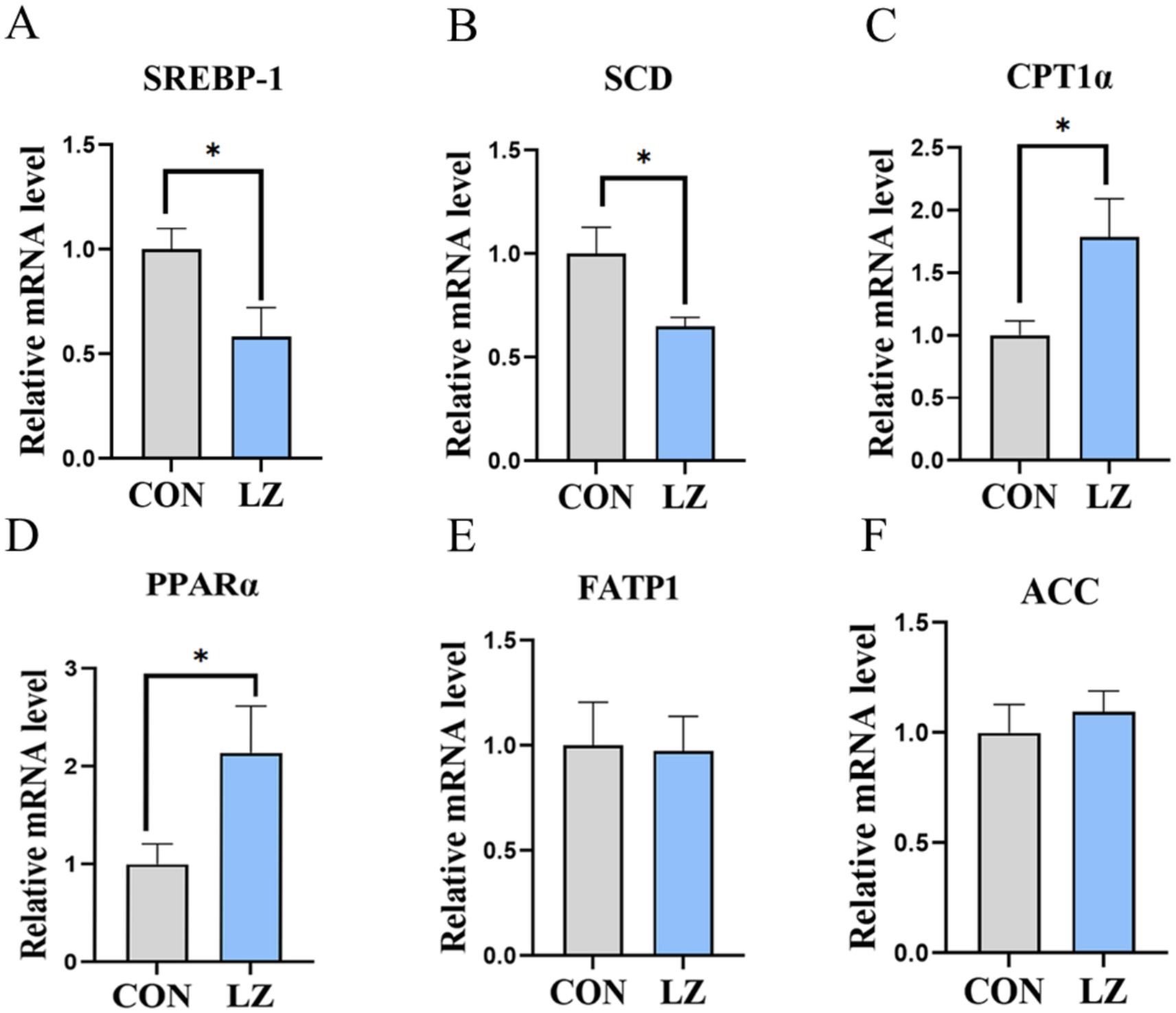 To evaluate the effects of LZ supplementation on lipid synthesis, catabolism, and transport of weaned piglets, we measured the related gene expression in the liver (Figure 4). The results showed that the mRNA expression of carnitine palmitoyl transferase 1 α (CPT1α) and peroxisome proliferator activated receptors (PPARα) were significantly increased (p < 0.05), and stearoyl-CoA desaturase (SCD) and sterol regulatory element-binding protein 1 (SREBP1)were significantly down-regulated (p < 0.05) in the liver in the LZ group compared with the CON group.