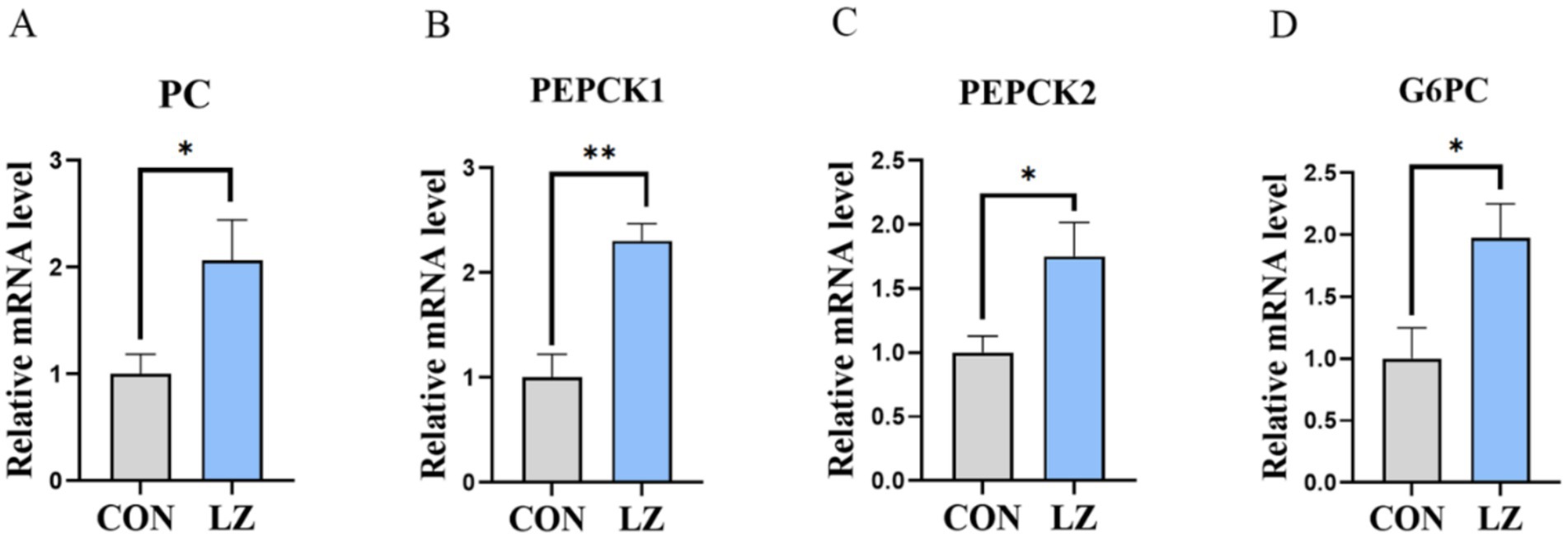 Relative mRNA expression of genes related to glucose metabolism in the liver (Figure 5) showed that dietary LZ could significantly increase expression of phosphoenolpyruvate carboxykinase (PEPCK), pyruvate carboxylase (PC) and Glucose-6-phosphate dehydrogenase (G6PC).