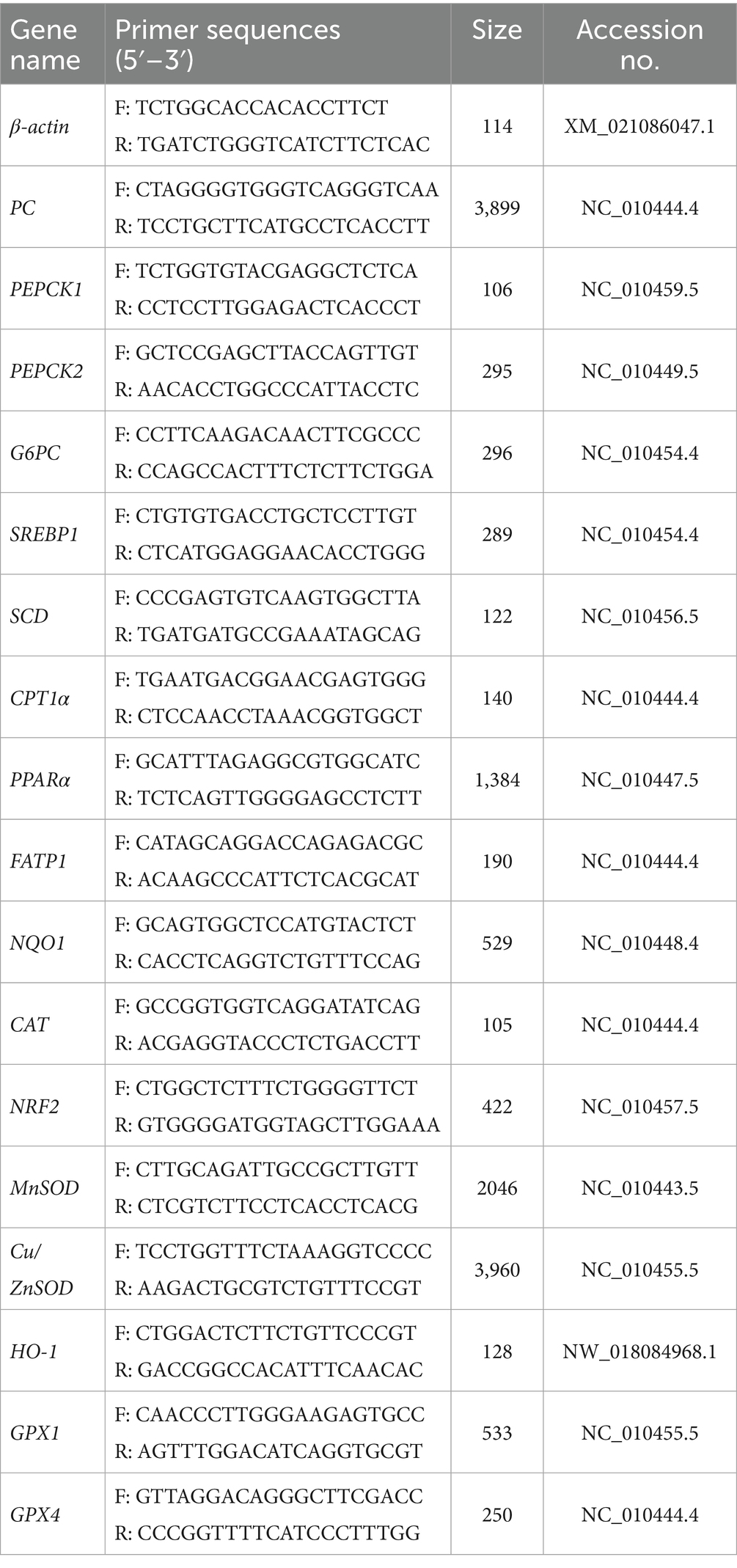 According to our previous study (3), total RNA was isolated from the liver tissue, and the concentration and purity of RNA were determined by NanoDrop Oneᶜ (Thermo Fisher Scientific, Waltham, MA, USA). According to the instructions of the Primer-script TM RT Reagent Kit with gDNA Eraser (TaKaRa, Dalian, China; Code No. RR047A), gDNA was removed and reverse-transcribed and the reverse-transcribed cDNA was stored in a refrigerator at −20 °C for later use. According to the manufacturer’s protocol, the RT-qPCR was performed on a Roche LightCyclerfi 480 instrument II (Roche, Basel, Switzerland) with 10 μL total volume reaction, consisting of 5 μL 2X SYBRR Green Pro Taq HS Premix II, 2 μL cDNA template, 0.4 μL each of the forward and reverse primers, and 2.2 μL RNase free water. Relative gene expression levels were analyzed using the 2(-ΔΔCt) method and normalization with β-actin as a housekeeping gene. The primers required were shown in Table 2.