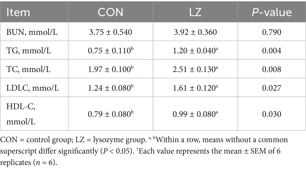 The liver participates in complex physiological processes, including lipid metabolism, glucose homeostasis, and oxidative stress, which play crucial roles in maintaining normal energy metabolism (4, 15). However, weaning stress induces hepatic oxidative stress and oxidative damage, severely impairing liver function in piglets. LZ is a safe, non-toxic biological enzyme with strong antioxidant properties (16–18). LZ contains a high proportion of hydrophobic and positively charged amino acids, whose antioxidant activities are markedly enhanced upon hydrolysis. Moreover, LZ can combine with other substances to further enhance antioxidant capacity (19, 20). Previous research demonstrated that dietary LZ supplementation significantly increased intestinal levels of SOD1 and GSH-Px in broiler chickens, indicating a beneficial effect on antioxidative capacity (11). Although few studies have reported the direct effects of LZ on glycolipid metabolism in weaned piglets, some studies suggested that LZ may indirectly influence glycolipid metabolism by modulating other biological functions (21). Thus, this study aimed to investigate the effects of LZ supplementation on hepatic glucolipid metabolism and antioxidant function in weaned piglets.