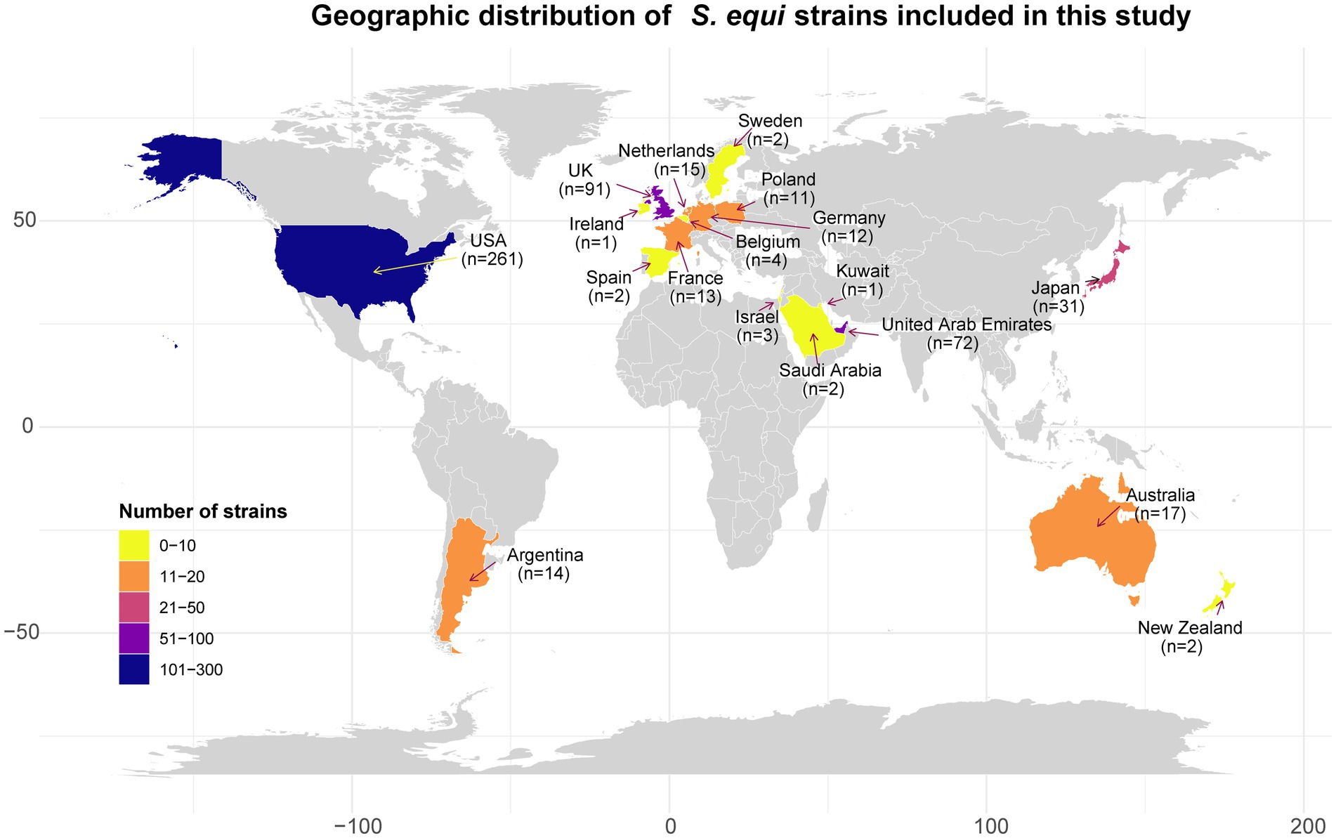 Figure 1. The geographical distribution of 552 S. equi strains examined in this study. Countries are colored according to the number of strains. The x-axis and y-axis represent longitude and latitude, respectively.
