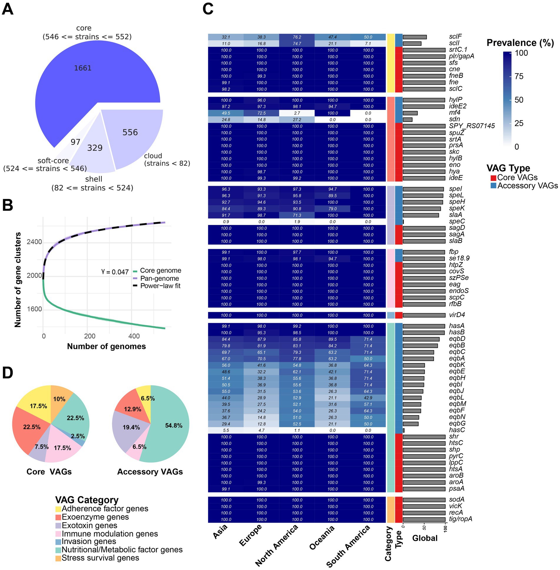 Figure 2. Pangenome analysis and VAG distribution pattern overview. (A) Pangenome analysis of 552 S. equi strains. The pie chart shows the number of protein-coding genes in the core, soft-core, shell, and cloud of the pangenome of 552 S. equi strains. The core genome is defined as genes present in 99–100% of 552 S. equi strains. Soft core, shell and cloud genomes are defined as those present in 95–99%, 15–95% and 0–15% of the strains, respectively. (B) Pan- and core-genome accumulation curves. The core-genome curve (green) and pan-genome curve (purple) show the number of gene clusters as genomes are sequentially added. The pan-genome curve was fitted to a power-law model (dashed line), yielding a γ of 0.047. Shaded areas indicate the interquartile range from 100 permutations. (C) Accessory VAGs prevalence in each continent and at the global level. (D) Different categories of core and accessory VAG proportion.