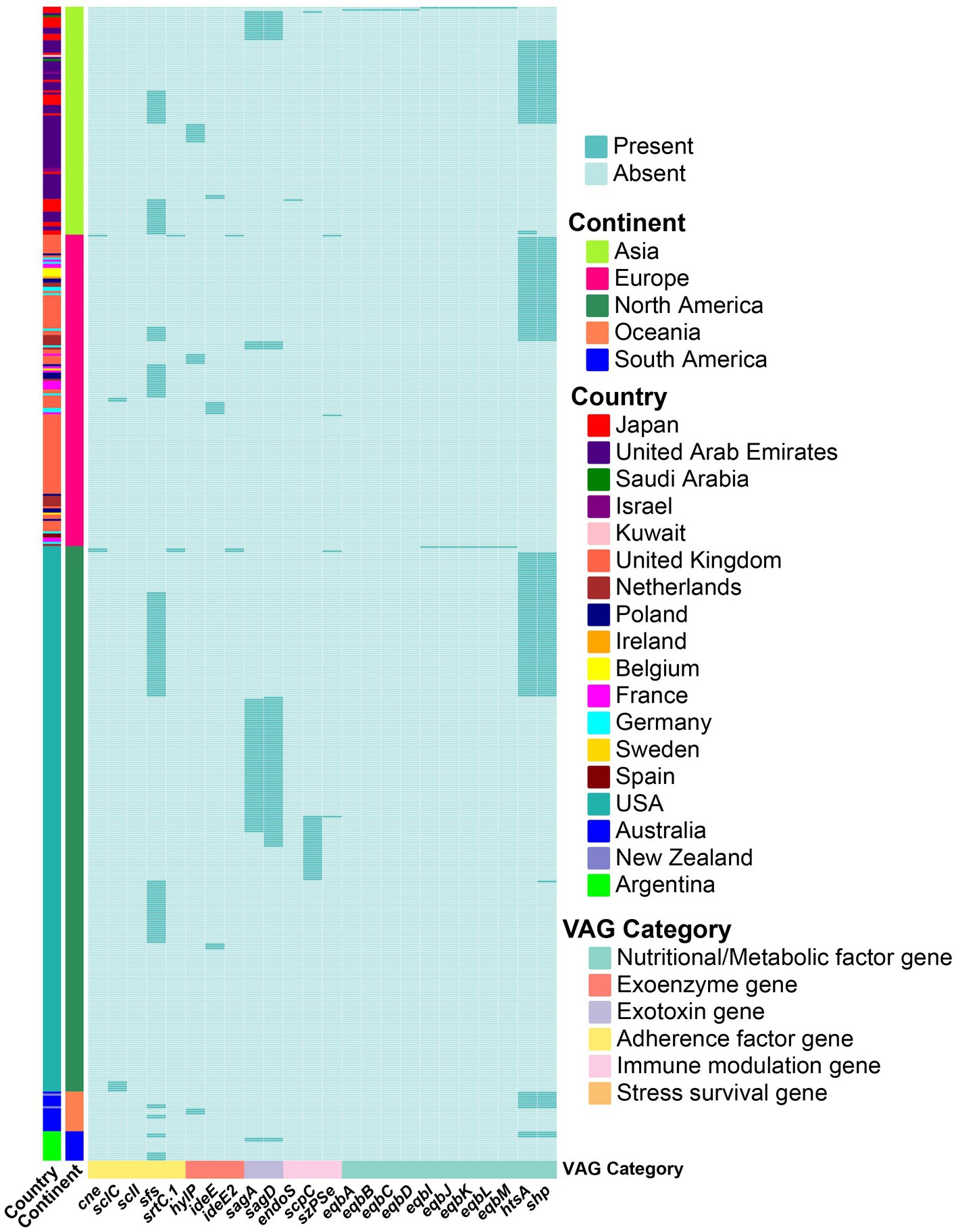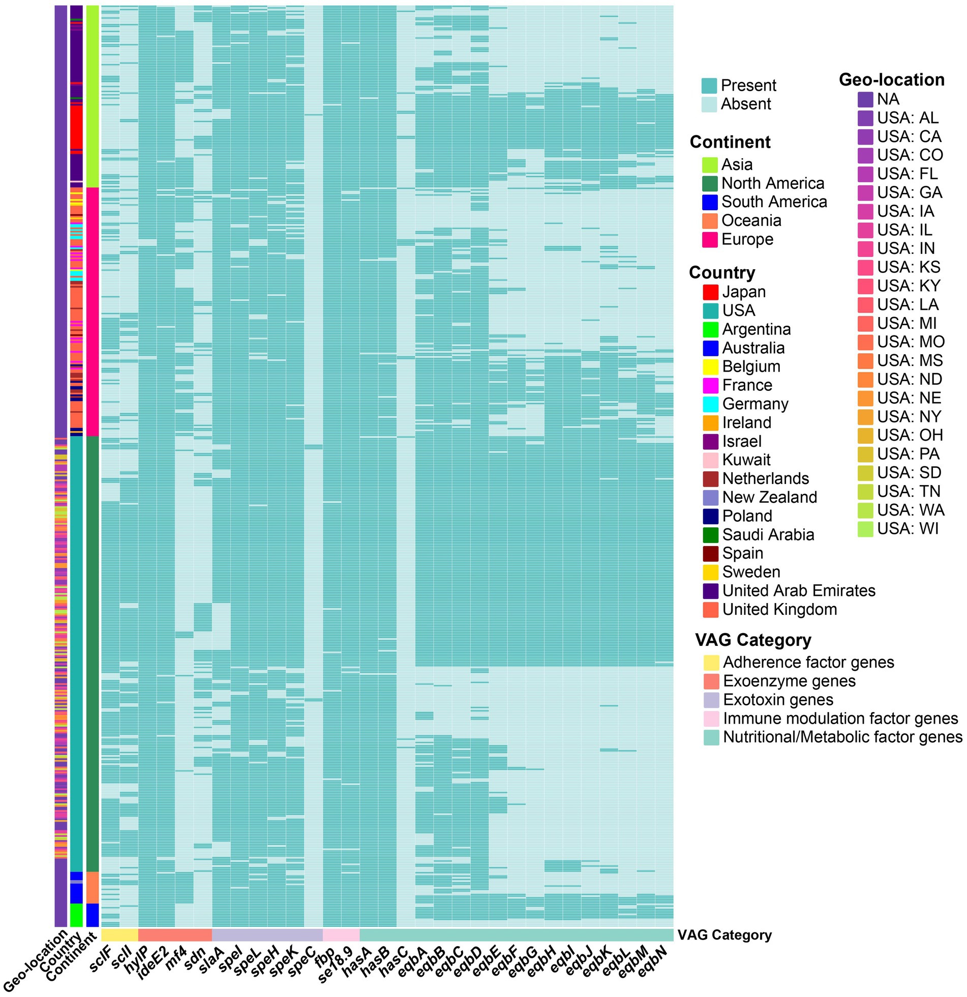 Figure 3. Heatmap showing the presence (green) or absence (light green) of accessory VAGs in S. equi strains from different continents. Each row represents a strain, grouped by continent (left annotation), country, and geo-location (additional left annotations). Each column represents a VAG, annotated by functional category. Strains are clustered based on gene presence/absence profiles. Country and geo-location annotations indicate the specific country and, for USA strains, the state of origin.