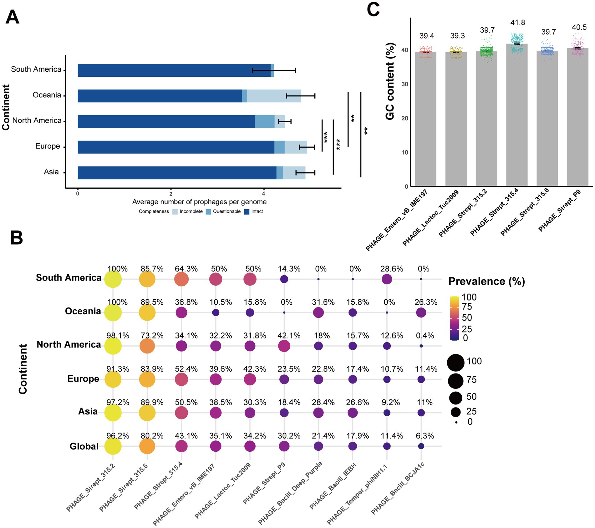 Figure 4. Diversity and distribution of prophages in S. equi across continents. (A) The integrity of prophages in S. equi from different continents. Stacked bar plots show the average number of intact, questionable, and incomplete prophages per genome for each continent. The average values are displayed as colored segments in each bar (blue: intact, light blue: questionable, gray blue: incomplete). (B) Bubble plot showing the prevalence of the top 10 prophages in S. equi strains across different continents and globally. Bubble size and color indicate the percentage of isolates carrying that prophage. Prevalence values are displayed inside each bubble. Prophages are ordered by their global prevalence. (C) Bar plot showing the average GC content (%) of the six most prevalent prophages in S. equi strains. Individual data points are shown as colored dots for each prophage. Bar charts display means with error bars representing 95% confidence intervals. Adjusted p-values were used to determine statistical significance, with thresholds defined as follows: p < 0.01 (**) and p < 0.001 (***).