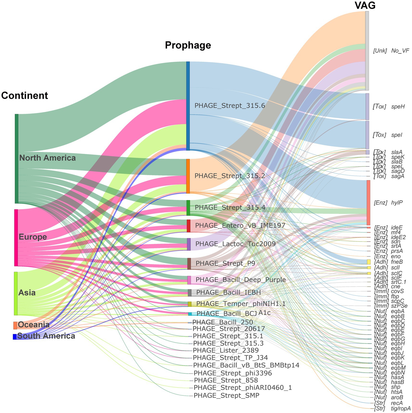 Figure 5. Contribution of the prophages to S. equi VAG distribution. Sankey diagram illustrating the prophage-encoding VAGs flow from continent to prophage to VAG. The left nodes represent continents, the middle nodes represent prophages, and the right nodes represent VAGs. Node and link colors indicate continent, prophage, and VAG category, respectively. VAG nodes are labeled with functional category abbreviations: Adh (Adherence factor gene), Enz (Exoenzyme gene), Tox (Exotoxin gene), Imm (Immune modulation gene), Inv (Invasion gene), Nut (Nutritional/Metabolic factor gene), Str (Stress survival gene).