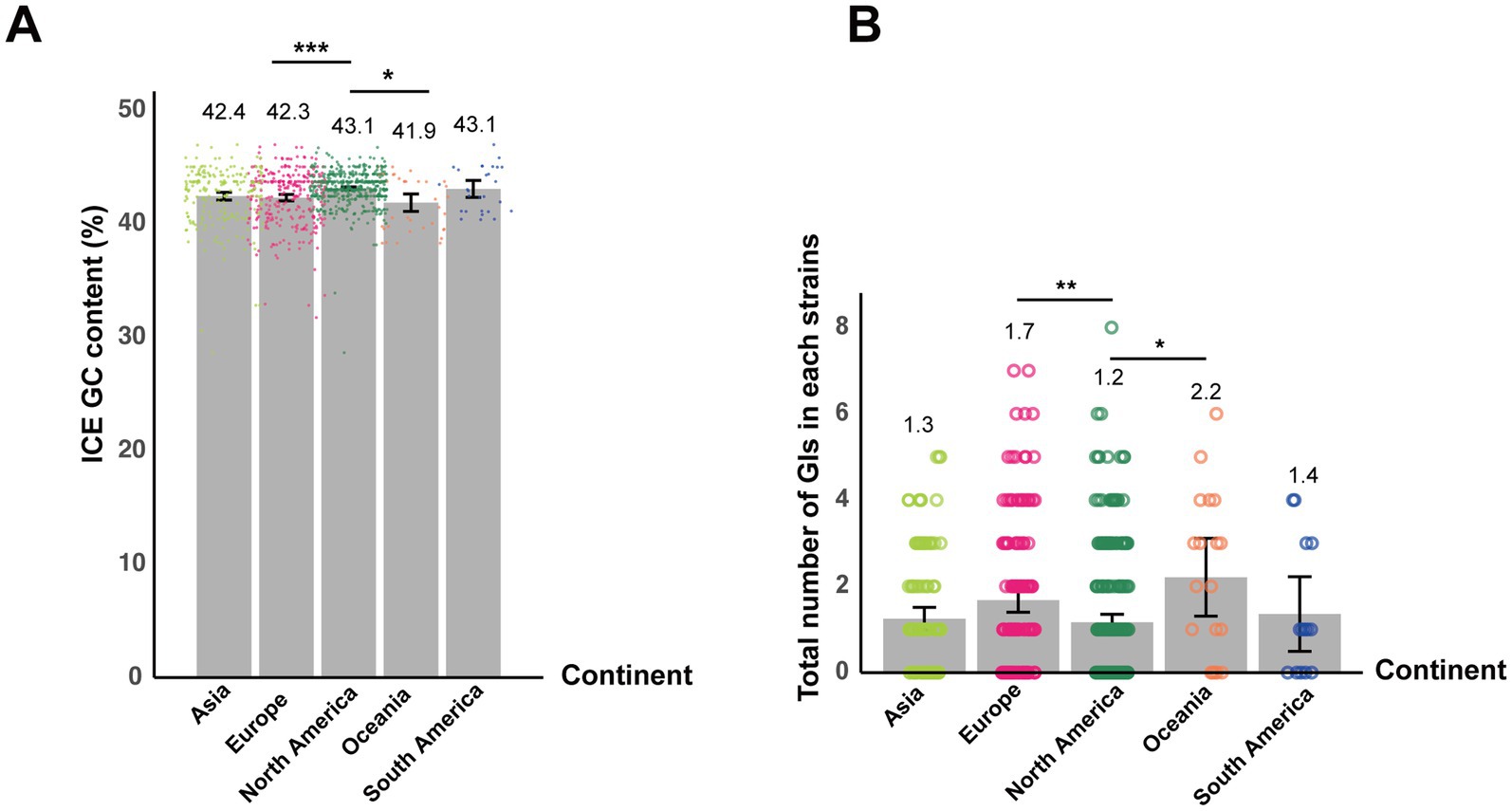 Figure 6. Geographic variation in ICE GC content and GI abundance among S. equi strains. (A) Bar plot showing the mean GC content of ICEs in S. equi strains from different continents. Individual data points are shown as colored dots. (B) Bar plot showing the average number of GIs per S. equi strain across different continents. Individual data points are shown as colored dots. Bar charts display means with error bars representing 95% confidence intervals. Adjusted p-values were used to determine statistical significance, with thresholds defined as follows: p < 0.05 (*), p < 0.01 (**), and p < 0.001 (***).
