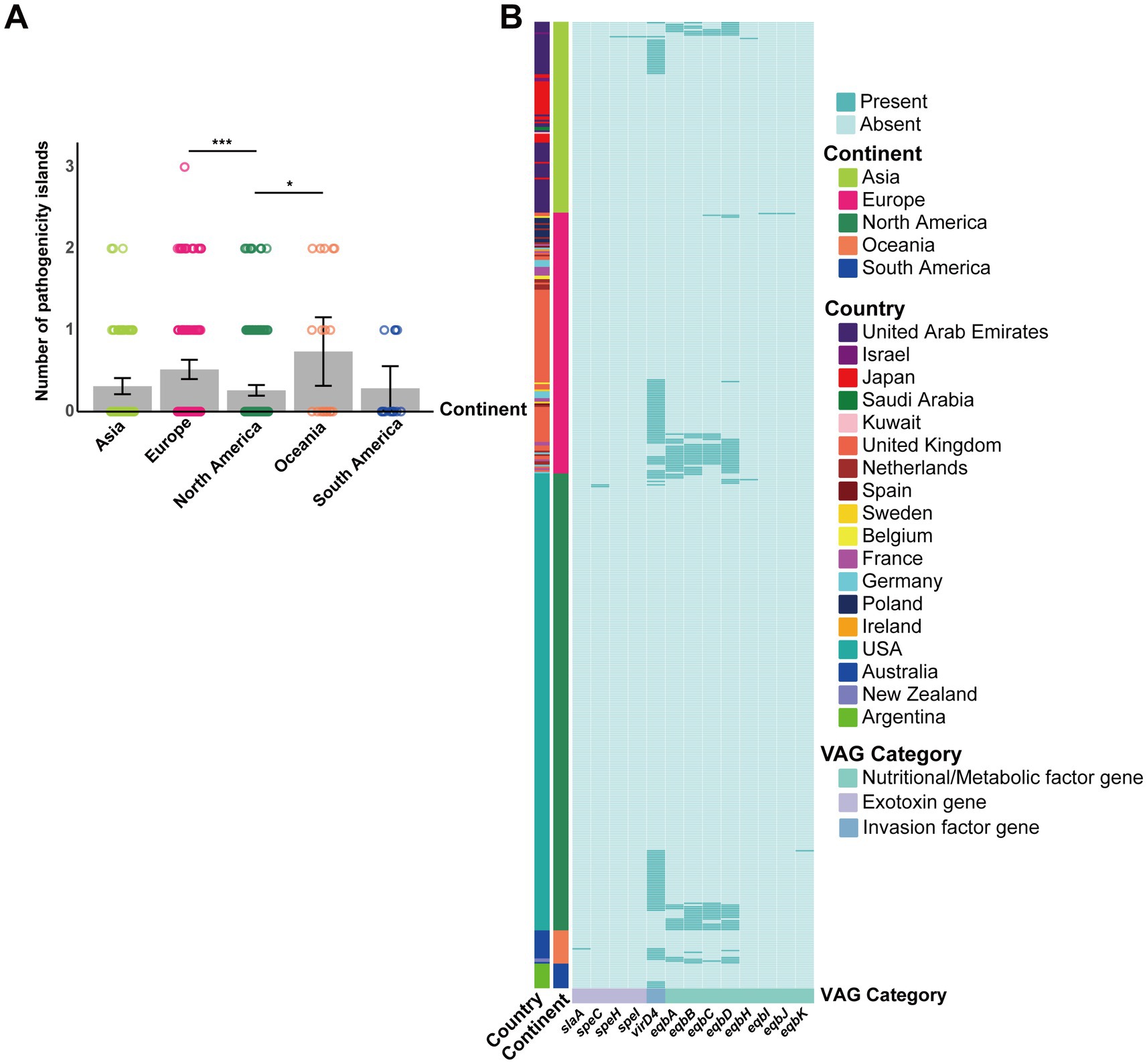 Figure 7. Contribution of GIs to S. equi VAG distribution. (A) Bar plot showing the average number of pathogenicity islands per S. equi strain across different continents. Individual data points are shown as colored dots. (B) Heatmap showing the presence (green) or absence (light green) of VAGs encoded by GIs in S. equi strains from different continents. Each row represents a strain, grouped by continent (left annotation). Each column represents a VAG, annotated by functional category. Strains are clustered based on gene presence/absence profiles.