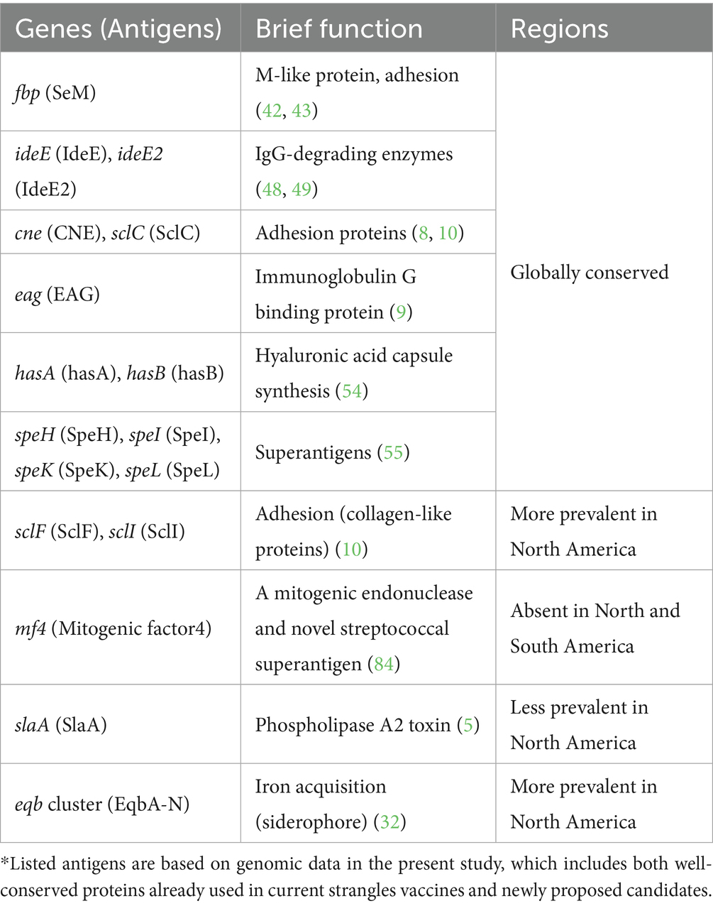 In conclusion, our analysis of 552 global S. equi genomes provides a comprehensive framework for understanding its accessory genome and genome adaptation. While acquired antibiotic resistance remains absent, geographic variations in MGEs and VAGs were observed. Our findings support the concept of “genome streamlining,” where this host-adapted pathogen sheds non-essential genes while retaining specialized genes. The geographic patterns likely arise from complex interactions involving host adaptation, and the ecological factors underlying these patterns remain to be determined. Future studies employing functional genomics, and long-read sequencing data will be necessary to clarify these dynamics. Our work provides a high-resolution map of S. equi VAGs, which is crucial for future vaccine strategies. While core antigens remain primary targets, the observed regional variations in key VAGs highlight the importance of ongoing genomic surveillance to monitor antigenic drift and inform the timely update of vaccine formulations (Table 1), thereby maintaining efficacy against evolving local pathogen populations.