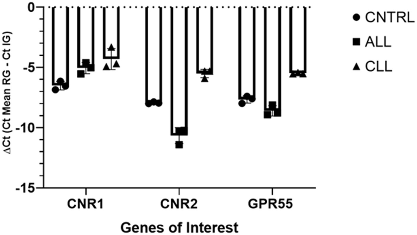 Figure 1. Gene expression of Cnr1, Cnr2, GPR55, in equine laminitic laminae in Healthy Laminae (CNTRL, n = 1), Acute Laminitis (ALL, n = 1), and Chronic Laminitis (CLL, n = 1). Each analysis was done in three independent experiments. The results are presented as ΔCt = (Ct Mean RG – Ct IG). For each gene, mean ± SD are indicated by horizontal bars.