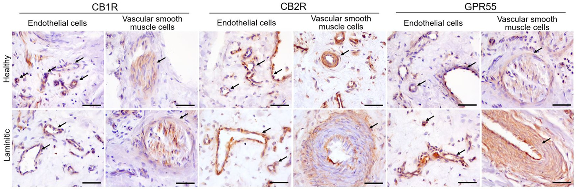 Results: The resident pool of inflammatory cells in the normal laminae and the inflammatory infiltrate cells of the affected equine laminae showed protein expression of CB2R and GPR55; no CB1R staining was seen at the inflammatory cells. Equine dermal fibroblast and endothelial cells exhibited protein expressions of CB1R, CBR2 and GPR55. Substance P positive nerve fibers were positive for CB1R.