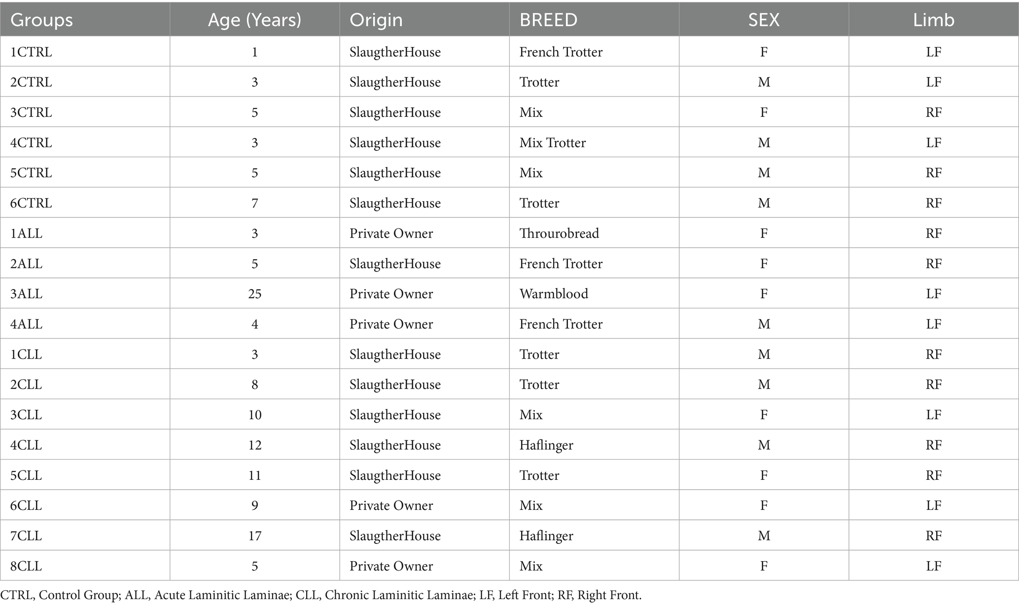 The samples were divided into three groups: Healthy Laminae (HL), Acute Laminitis (ALL), and Chronic Laminitis (CLL). Group division was based on a combination of clinical history, anamnesis, physical examination, and evidence of anatomical failure of the hoof (e.g., sinking of the third phalanx, rotation with severe angle, or excessive heel growth), as described (17).