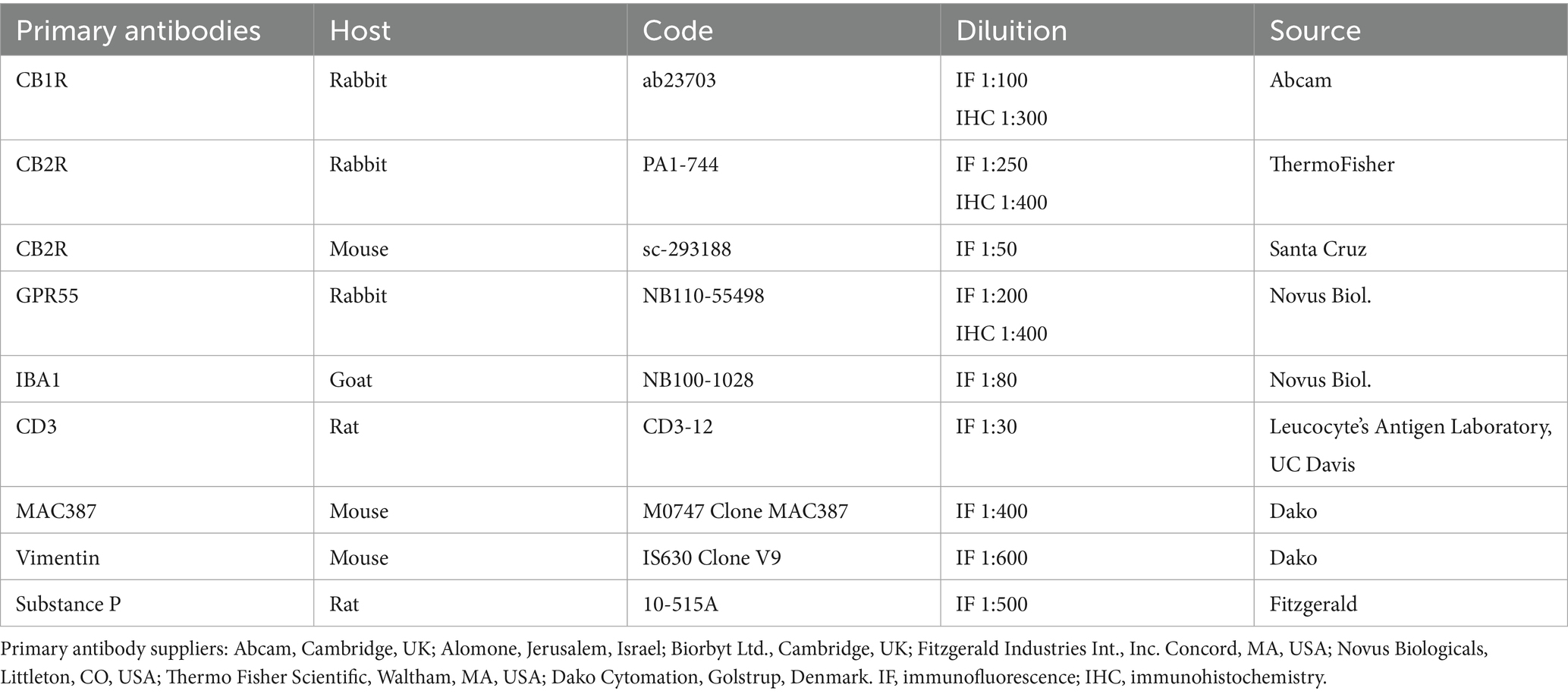 Methods: Analysis of CBR1, CBR2 and GPR55 protein expression was made by fluorescence microscopy with co-localization with antibodies against the macrophages marker IBA1, the T cell marker CD3, the neutrophils marker calprotectin (MAC387), the fibroblasts marker vimentin (Clove V9) and the nerve fibers marker Substance P. Preliminary analysis was performed to evaluate gene expression (Cnr1, Cnr2, and Gpr55) using real-time PCR and to verify the specificity of the primary antibody (Gpr55) with Western Blotting (WB).