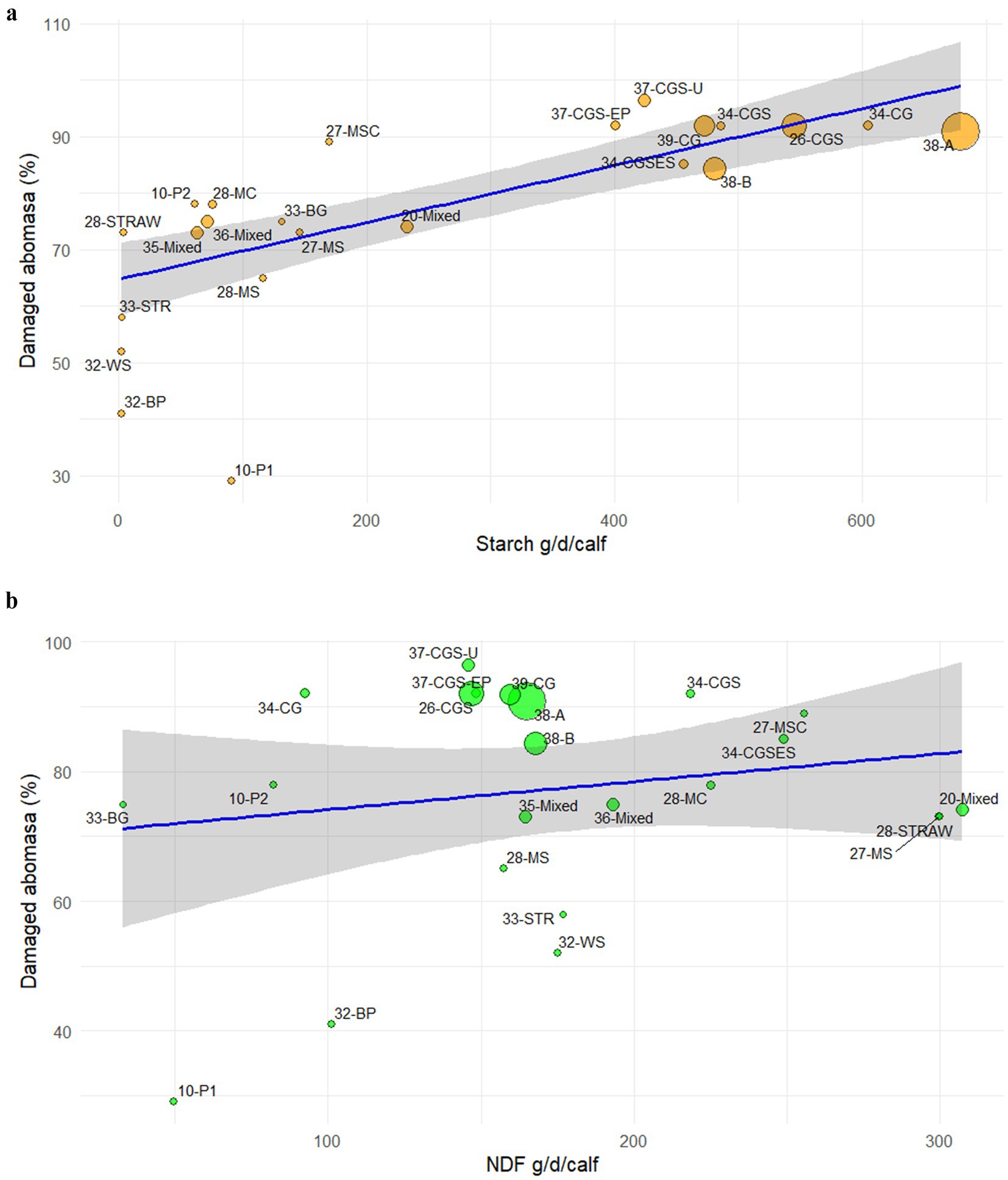 Figure 2. Linear meta-regression between the mean amount of (a) starch (Y = 0.05X + 65; R2 = 0.70) and (b) NDF (Y = 0.04X + 70; R2 = 0.01) administered to the veal calves through the solid feed during the fattening cycle and percentage of damaged abomasa. Bubbles are identified by reference number of the study – type of solid feed (Table 4). 10-P1: agglomerated ground barley; 10-P2: agglomerated ground barley + straw; 31-BP: beet pulp; 31-WS: wheat straw; 13-BG: Barley grain; 13-STR: straw; 20-/33-/34-Mixed: mixture of concentrate and fibrous sources; 28-STRAW: straw; 27-MSC: maize silage, straw, and concentrate mixture; 27-/28-MS: maize silage; 32-/37-CG: corn grain; 26-/32-CGS: corn grain and straw; 32-CGSES: corn grain, wheat straw, extruded soybean; 28-MC maize cob silage; 35-CGS-U: corn grain, straw, urea; 35-CGS-EP: corn grain, straw, extruded pea; 36-A: cereal grains mix; 36-B: cereal grain mix and corn silage.