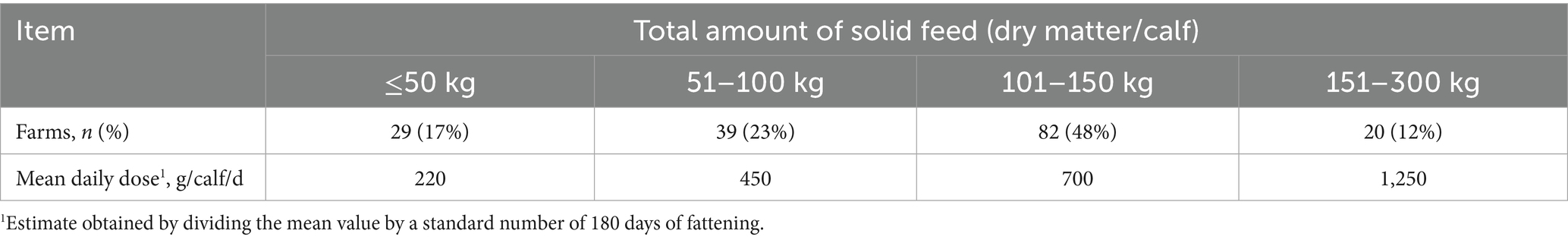 Table 2. Number and percentage of veal farms according to the total amount of dry matter (DM) from solid feeds administered to the veal calves throughout the fattening cycle and estimated daily dose of solids feed per calf modified from Brscic et al. (20).