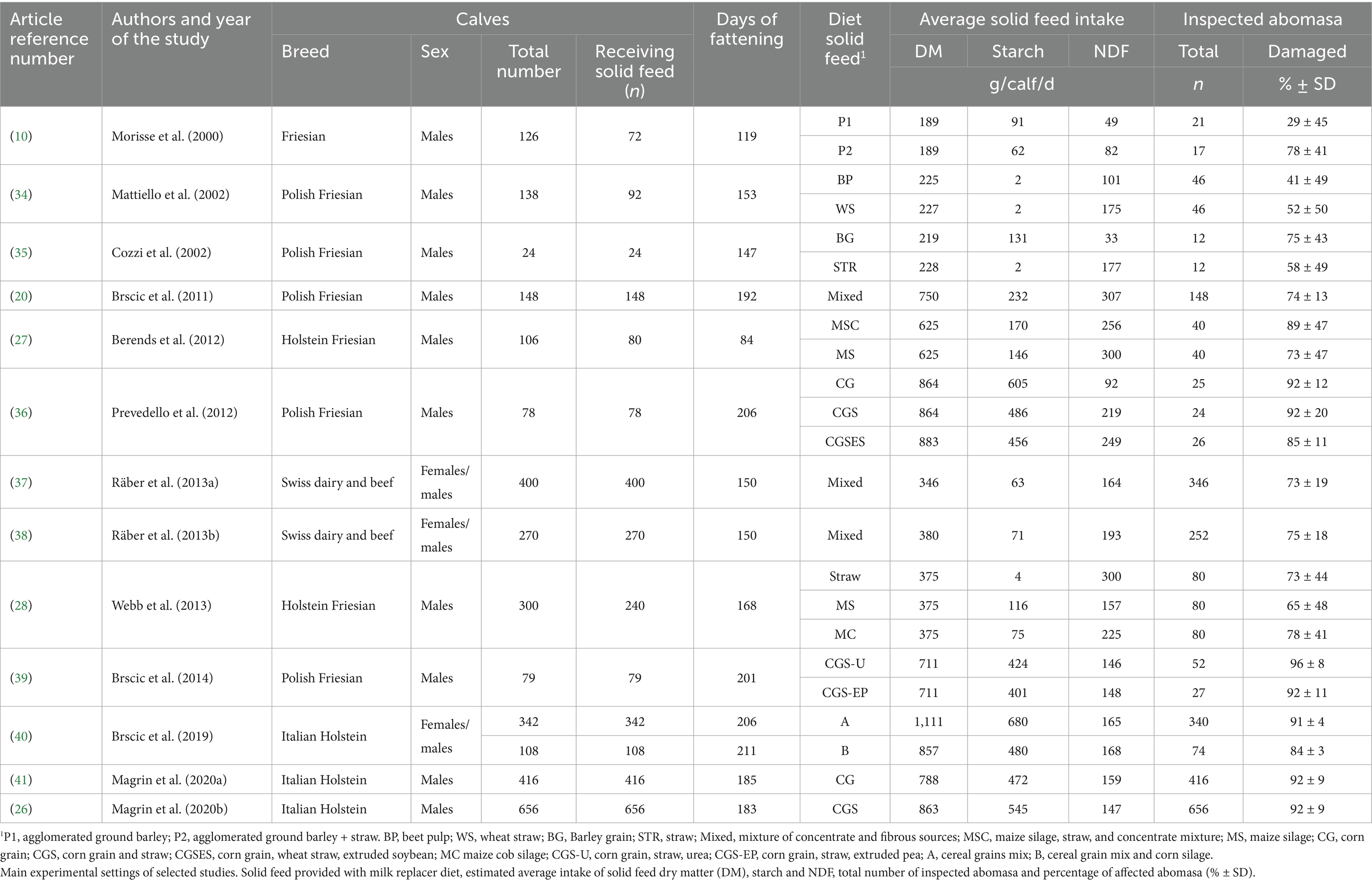 In line with the outcomes of previous studies (27, 28), the provision of solid feed leads also to a high prevalence of abomasal lesions (Table 3). A previous review (22) has hypothesized that solid feeds might amplify abomasal damage that has already been caused by the ingestion of large quantities of milk replacer in two ways. The former is by causing a direct trauma, often referred in the literature as abrasion, to the abomasa wall. The latter is by blocking the pylorus, thereby delaying digesta from leaving the abomasum and exacerbating abomasal overloading by extending the time during which large quantities remain in the abomasum. To deepen the knowledge about the relation between amount and type of solid feed and abomasal damage in veal calves, we carried out a review of the existing literature. The first aim was to estimate the relationship between the amount of administered solid feed and abomasal damage. A further step aimed at investigating the relationship between abomasa damage and the amounts of single chemical components of the ingested solid: starch and fiber (NDF), in particular. To retrieve the data, the same search string (22) was applied to the Scopus database (Elsevier; accessed on 1 September 2025): [Abomas* AND (damage OR ulcer* OR lesion* OR scar*)] AND (veal calf OR veal calves). The search covered the period 2000–2024, yielding 29 documents. Exclusion criteria were: non-English language (two documents excluded) and review articles (one document excluded). In addition, eight studies did not report solid-feed data, three studies were not relevant to the research topic, and two studies were methodological papers without available data. Thirteen research papers reported the association between supplied SF and abomasa damage (Table 4). The amount of SF was calculated from the reported values in terms of dry matter (DM), starch and NDF per calf per day. When this information was not reported in a given paper, they were estimated by using other data (e.g., total amount of solid; duration of the cycle, number of animals, amounts supplied expressed as as-fed etc.). When not reported in the original study, reference values of chemical composition for different feed ingredients (29) were used to estimate the dry matter content of the SF. Likewise, the amounts of NDF and starch from SF consumed by the calves during the fattening period were estimated using the same feed composition database (29). In the case of mixed feeds, chemical composition values were estimated by weighting the tabular mean values of the individual ingredients according to their inclusion rates. As the protocols to define and detect the different lesions in the abomasa also varied between studies, in order to standardize and make the results comparable, an attempt was made to identify the percentage of affected abomasa for each paper (expressed as the percentage of total abomasa damaged out of the total inspected organs). Moreover, some of the selected articles reported different values for the abomasa damages caused by various tested solids. In these cases, the mean value of the reported percentages was considered. This decision was made because none of the articles reported a significant effect due to the different types of solids tested on the percentage of damage to the abomasum. The relationship between the mean daily amount of administered SF and the percentage of damaged abomasa was analyzed by a meta-regression analysis (30). We explored potential sources of heterogeneity using random-effects meta-regression model. All analyses were conducted in R using the metafor package (31). The results were shown in Figure 1.
