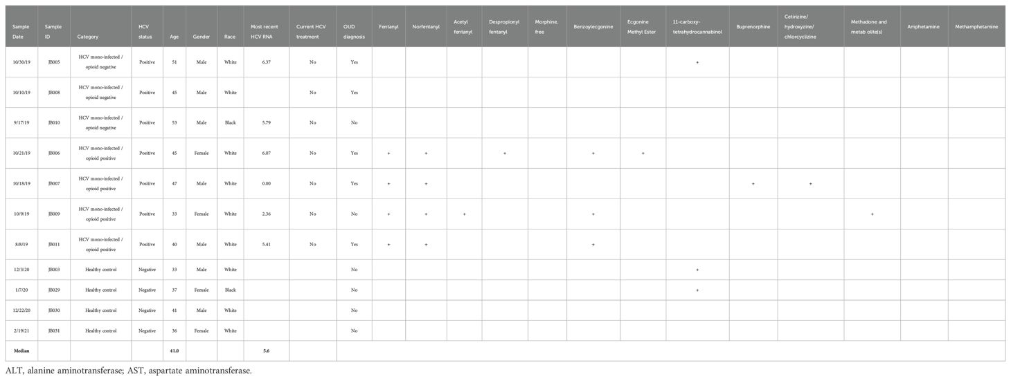 Eleven blood samples were collected from 4 HCV-positive individuals with current fentanyl use, 3 HCV-positive individuals without current fentanyl use, and 4 HCV-negative, non-opioid-using healthy controls (Table 1).