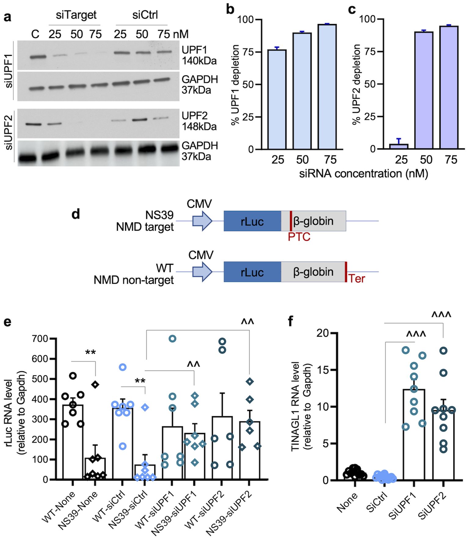 When transfected with siUPF1 or siUPF2, the accumulation of NS39 reporter RNA increased by 0.99–1.89-fold and 3.44–5.44-fold, respectively, compared to its level in controls (Figure 1c). No significant effects of UPF1 or UPF2 depletion were observed on WT (non-NMD target) reporter RNA levels (Figure 1c). Alternatively spliced mRNA for tubulointerstitial nephritis antigen-like 1 (TINAGL1), a known endogenous NMD target (16), also increased by 7.52–26.24-fold in UPF1- and UPF2-depleted (vs. control) cells (Figure 1d).