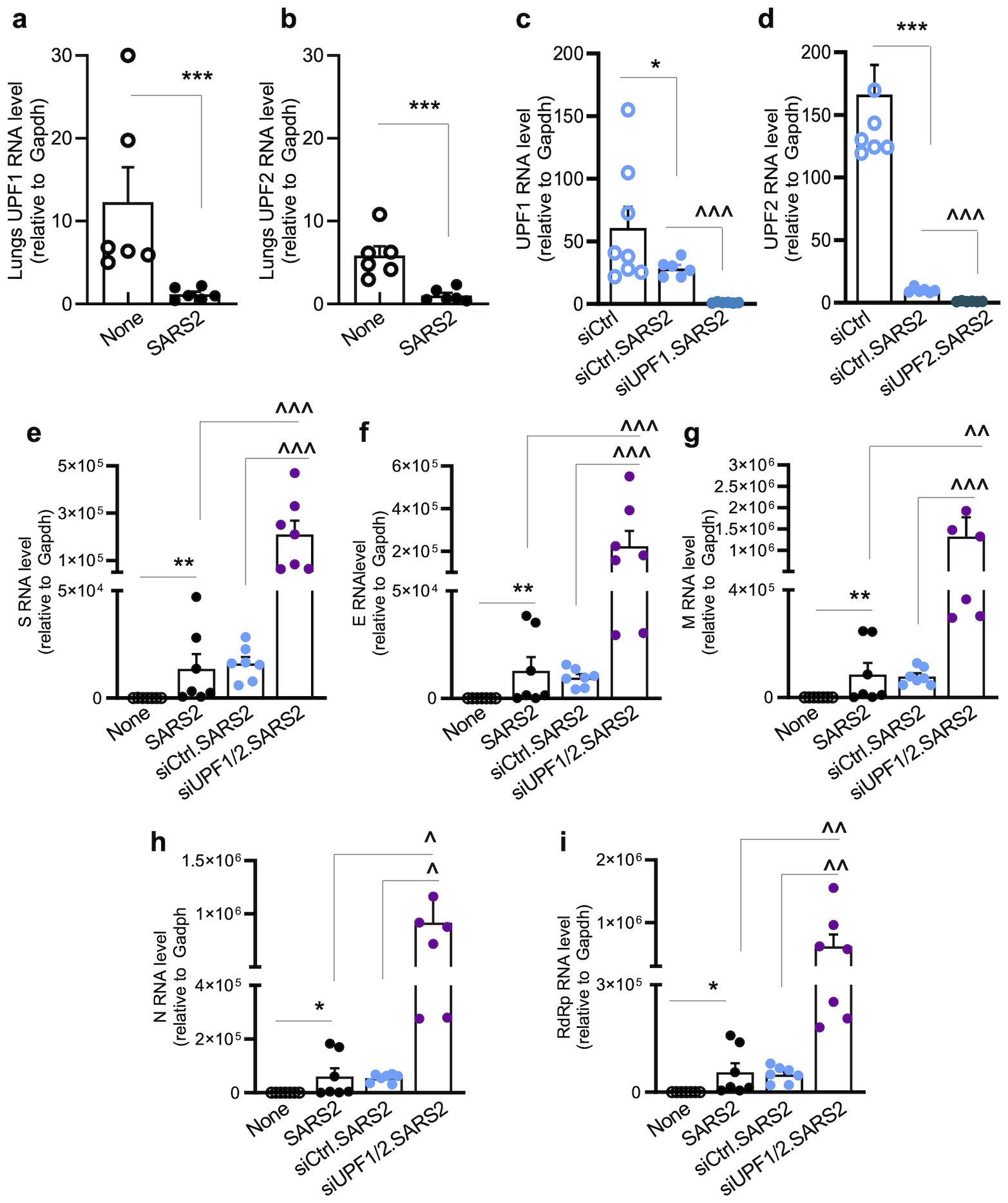 Figure 2. (a–d) SARS-CoV-2 suppresses UPF1/UPF2 expression. For in vivo studies (a, b), hACE2tg mice were intranasally challenged with 102 TCID50 of SARS-CoV-2, euthanized at 4–5 days post-infection, and lung tissues were harvested. For in vitro studies (c, d), A549ACE2+ cells were transfected with siCtrl, siUPF1, or siUPF2 siRNAs (75 nM each) and infected with SARS-CoV-2 (MOI: 1.0) for 24 h. Samples were analyzed in duplicate by RT-qPCR for mRNA levels of UPF1 and UPF2, and data were normalized to Gapdh. Controls: mock infected. Individual data points (average of duplicate values from each sample) and mean ± SEM values (n = 6–8 samples per group) are shown. (e–i) Effects of UPF1/UPF2 depletion on SARS-CoV-2 RNA. A549ACE2+ cells were nontransfected or transfected with siCtrl or siUPF1/siUPF2 siRNAs (75 nM each) for 48 h, and infected with SARS-CoV-2 (MOI: 1.0) for 24 h. RT-qPCR analysis of SARS-CoV-2 subgenomic RNAs (S, E, M, N) was performed using a common leader sequence and target-specific primers, and genomic RNA was amplified using RdRP-specific primers; relative levels of SARS-CoV-2 transcripts (normalized to Gapdh) were calculated. Individual data points from each biological sample (average of duplicate observations) and mean ± SEM values (n = 6–8 biological samples/group) are plotted. Student’s unpaired t-test with Mann–Whitney U-test (a, b) and one-way ANOVA with Tukey’s or Kruskal–Wallis/Dunn’s post hoc tests (c–i) were applied to calculate significance; p-values of ≤0.05, ≤0.01, and ≤0.001 are annotated with 1, 2, and 3 symbols, respectively (*control vs. infected; ^infected vs. siUPF1 and/or siUPF2-treated/infected). Horizontal bars show the compared groups. p-values of ≤0.05*,^, ≤0.01,^^, and ≤0.001,^^^ are plotted (control vs. infected; ^infected vs. siUPF1-treated/infected or siUPF2-treated/infected).