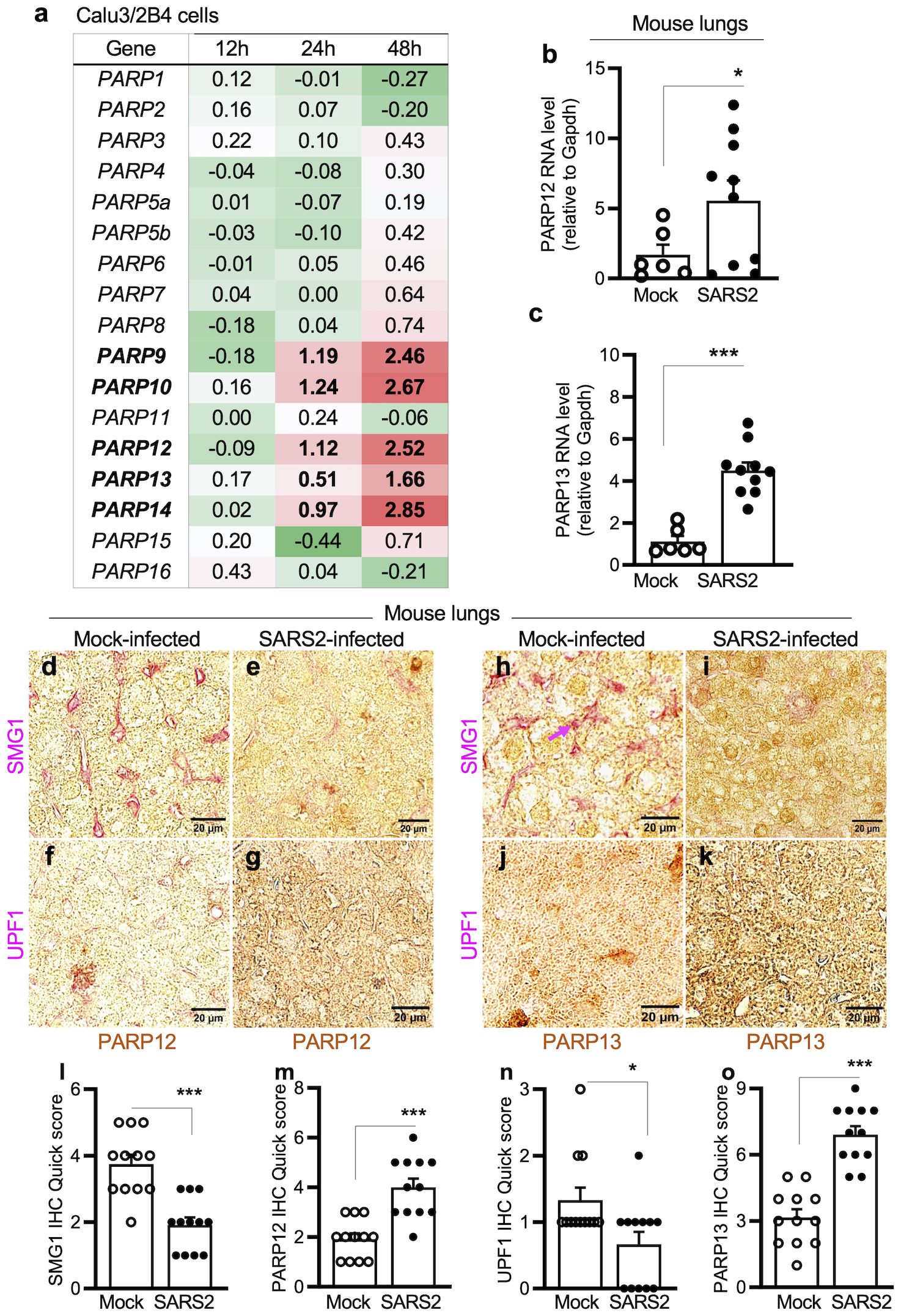 Figure 3. (a–c) Expression of poly(ADP-ribose) polymerases in response to SARS-CoV-2 infection. For in vitro studies (a), human lung epithelial Calu-3/2B4 cells (ACE2+ clone) were infected in triplicate with SARS-CoV-2 (MOI: 1.0) for 12, 24, and 48 h and subjected to RNA-seq analysis. Averages of log2 fold changes in mRNAs for PARP1–PARP16 in infected (vs. mock-infected) cells after normalizing to housekeeping controls are shown (red: upregulation; green: downregulation). Significance was calculated by Student’s unpaired t-test with Mann–Whitney U-test; bolded values show significance (p ≤ 0.01) between control vs. infected samples. For in vivo studies (b, c), hACE2tg mice were intranasally challenged with 102TCID50 SARS-CoV-2 (controls: mock infected) for 4–5 days. RT-qPCR for PARP12- and PARP13-encoding mRNAs (normalized to Gapdh) in lung tissues was performed. Individual data points from each mouse (average of duplicate observations) and mean ± SEM values (n=6–10 mice/group) are plotted. (d–o) Immunohistochemistry for PARPs and NMD factors in lungs of mice infected with SARS-CoV-2. The hACE2tg mice were intranasally challenged with 102TCID50 SARS-CoV-2 (controls: mock infected) for 4–5 days. Paraffin-embedded 5-μm lung tissue sections were subjected to dual immunohistochemistry. Representative images identifying the expression of PARP12 (d–g) and PARP13 (h–k) (brown) and NMD factors SMG1 (d,e, h, i) and UPF1 (f, g, j, k) (magenta) are shown (scale bar: 20 μm), and quick IHC scores for each antigen are plotted in l–o. Data points for each tissue section (average of scanning in 9 microscopic fields) and mean ± SEM values (n ≥ 6 mice/group, 3 tissue sections/mouse) are shown. Significance comparing control and infected groups was calculated by Student’s unpaired t-test with Mann–Whitney U-test. In all bar graphs, p-values are plotted as *p≤0.05, **p≤0.01, ***p≤0.001. Horizontal bars show the compared groups. In bar graphs, p-values are plotted as p≤0.05*, p≤0.01, p≤0.001*. Horizontal bars show the compared groups.