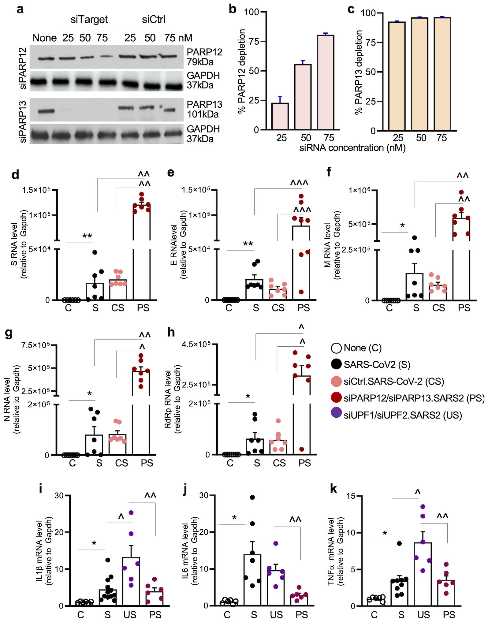 Figure 4. (a–c) PARP12/PARP13 depletion. A549ACE2+ cells were transfected with 25-75nM of control (siCtrl) or target-specific (siPARP12, siPARP13) siRNAs for 48 h. Representative western blots for PARP12 and PARP13 (control: GAPDH) are shown in (a). Densitometry analysis of PARP12 and PARP13 bands (relative to GAPDH) was performed, and percent depletion of PARP12 and PARP13 in cells transfected with target-specific (vs. siCtrl) siRNAs was calculated for (b, c). (d–k) Effects of PARP12/PARP13 depletion on SARS-CoV-2 RNA stability and cytokine response. A549ACE2+ cells were not transfected or were transfected with siRNAs (75nM each) for 48h, and mock infected or infected with SARS-CoV-2 (MOI: 1.0) for 24 h. RT-qPCR was performed to examine the levels of SARS-CoV-2 subgenomic RNAs (S, E, M, N) and genomic RdRP RNA (d–h), and host cytokine gene expression (IL1β, IL6, and TNFα (i–k). Data were normalized to Gapdh. Individual data points from each biological sample (average of duplicate observations) and mean ± SEM values (n=6–8 biological samples/group) are plotted. Significance was calculated by one-way ANOVA with Tukey’s or Kruskal–Wallis/Dunn’s post hoc tests; p-values of ≤0.05, ≤0.01, and ≤0.001 are annotated with 1, 2, and 3 symbols, respectively (*control vs. infected; ^infected vs. siPARP12 and/or siPARP13-treated/infected). Horizontal bars show the compared groups. p-values of ≤0.05*,^, ≤0.01,^^, and ≤0.001,^^^ are plotted (control vs. infected; ^infected vs. siPARP12-treated/infected or siPARP13-treated/infected).