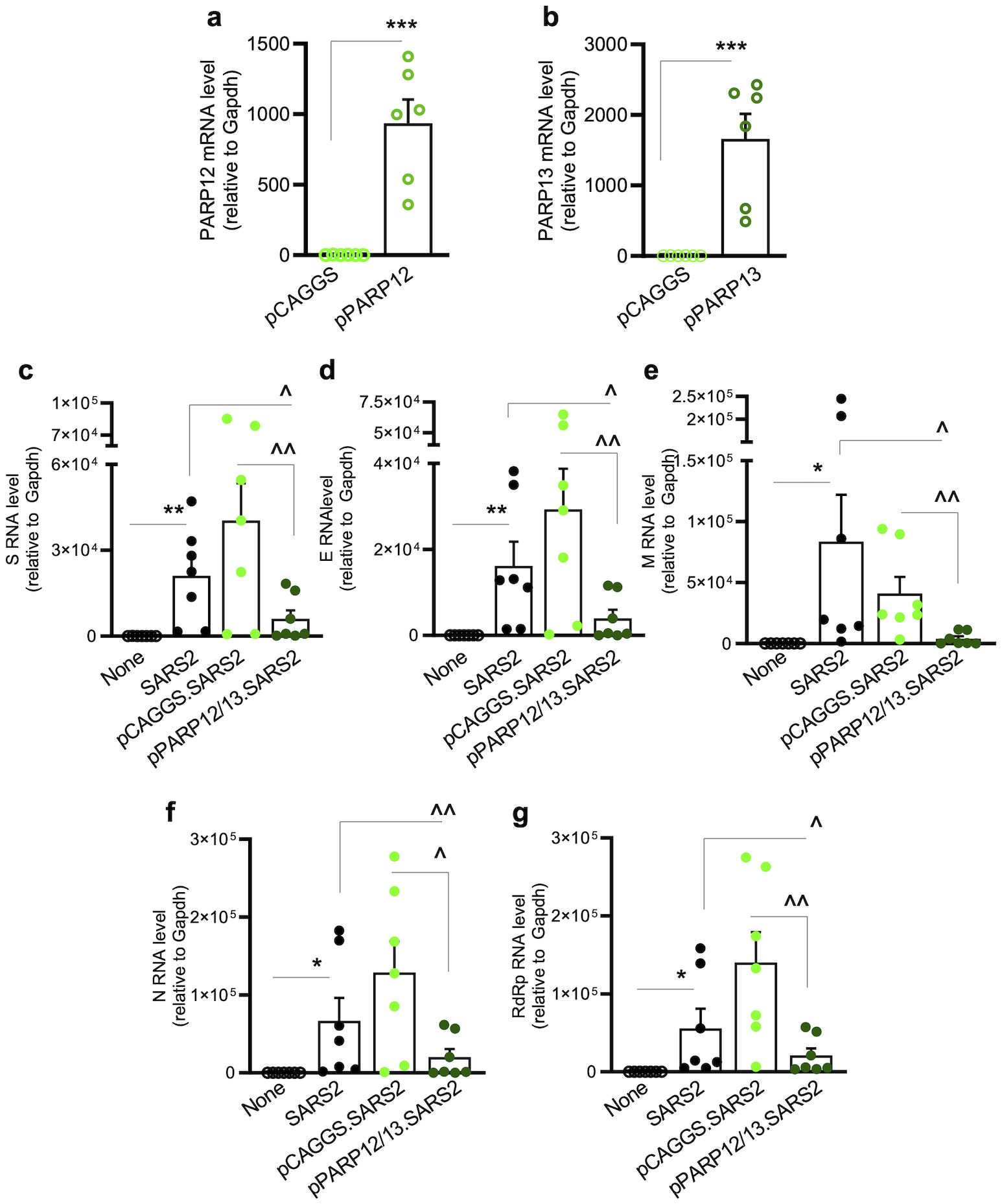 Figure 5. PARP12/PARP13 overexpression decreases SARS-CoV-2 RNA levels. A549ACE2+ cells were transfected with pCAGGS, pCAGGS-PARP12 and/or pCAGGS-PARP13 expression plasmids (1μg each) for 48h, mock infected or infected with SARS-CoV-2 (MOI: 1.0) for 24 h, and analyzed by RT-qPCR. (a, b) PARP12 and PARP13 transcript levels. (c–f) SARS-CoV-2 subgenomic RNAs (S, E, M, N) were amplified with a common leader sequence and target-specific primers, and genomic RNA was amplified using RdRp-specific primers. Target-specific Ct values were normalized to Gapdh Ct values, and relative RNA levels were calculated. Individual data-points from each biological sample (average of duplicate observations) and mean ± SEM values (n=5–8 biological samples per group) are plotted. Significance was calculated by Student’s unpaired t-test with Mann-Whitney U-test (a, b) and one-way ANOVA with Tukey’s or Kruskal-Wallis/Dunn’s post-hoc tests (c–h), and p-values of ≤0.05, ≤0.01, and ≤0.001 are shown with 1, 2, and 3 symbols, respectively (*control vs. infected; ^infected vs. siPARP12 and/or siPARP13-treated/infected). Horizontal bars show the compared groups. p-values of ≤0.05*,^, ≤0.01,^^, and ≤0.001,^^^ are plotted (control vs. infected; ^infected vs. siPARP12-treated/infected or siPARP13-treated/infected).