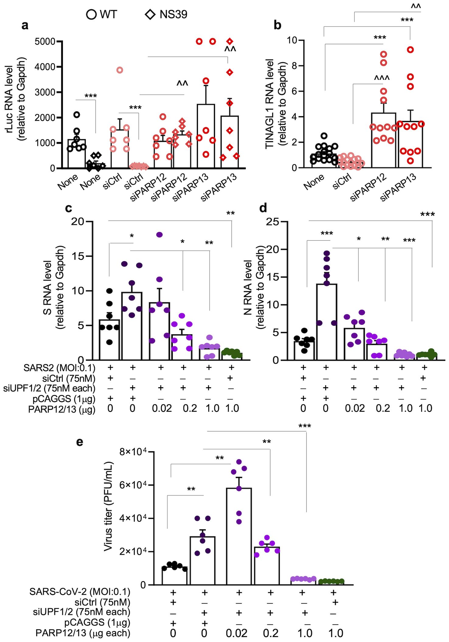 Figure 6. PARP12/PARP13-NMD regulation of SARS-CoV-2 RNA decay. (a, b) PARP12/PARP13 depletion enhances the stability of NMD target reporters. A549hACE2+ cells were transfected with siCtrl, siPARP12, or siPARP13 siRNAs (75nM each) for 48h and WT (NMD non-target) or NS39 (NMD target) reporter (1µg each) for 24h. Cells were analyzed by RT-qPCR for (a) rLuc encoded by WT and NS39 reporters and (b) TINAGL1 (endogenous NMD target) levels. Each biological sample (average of duplicate analysis) is plotted as a dot, and mean ± SEM values derived from n=6–8 biological samples per group are plotted as bars. Significance was calculated by one-way ANOVA with Tukey’s or Kruskal–Wallis/Dunn’s post hoc tests; p-values of 0.05, ≤0.01, and ≤0.001 are plotted with 1, 2, and 3 symbols, respectively (*WT vs. NS39; ^siCtrl vs. siPARP12 or siPARP13 in NS39-transfected groups). Horizontal bars show the compared groups. (c, d) Effects of PARP12/PARP13 and UPF1/UPF2 on SARS-CoV-2 transcripts. A549ACE2+ cells were transfected with siCtrl or siUPF1 and siUPF2 siRNAs (75nM each) for 48h, and 0.02, 0.2, or 1.0-µg of PAPR12 and PARP13 encoding pCAGGS plasmids (control: 1μg pCAGGS) for 24h. Cells were then infected with SARS-CoV-2 (MOI: 0.1) for 24h, and analyzed by RT-qPCR for S and N subgenomic RNAs using leader sequence and target-specific reverse primers. For panels a–d, target-specific Ct values were normalized to Gapdh Ct values, and relative RNA levels of the targets were calculated. Individual data points from each biological sample (average of duplicate observations) and mean ± SEM values (n = 6–8 biological samples per group) are plotted. (e) PARP12/PARP13 and UPF1/UPF2 regulation of SARS-CoV-2 replication. A549ACE2+ cells were sequentially transfected with siCtrl or siUPF1 and siUPF2 siRNAs (75nM each, 48h) and PAPR12- and PARP13-encoding pCAGGS plasmids (0.02-1.0-µg each, 24h) and then infected with SARS-CoV-2 (MOI: 0.1, 24h). Culture supernatants (10-fold dilutions up to 10-6) were analyzed in triplicate by plaque assay, as described in Methods. Significance for c–e was calculated by one-way ANOVA with Tukey’s or Kruskal–Wallis/Dunn’s post hoc tests; p-values are plotted as *p≤0.05, **p≤0.01, ***p≤0.001. Horizontal bars show the compared groups. For (a, b) p-values of ≤0.05*,^, ≤0.01,^^, and ≤0.001,^^^ are plotted (WT vs. NS39; ^siCtrl vs. siPARP12 or siPARP13 in NS39-transfected groups). For (c–e), p-values are plotted as ≤0.05*, ≤0.01, ≤0.001* and horizontal bars show the compared groups.