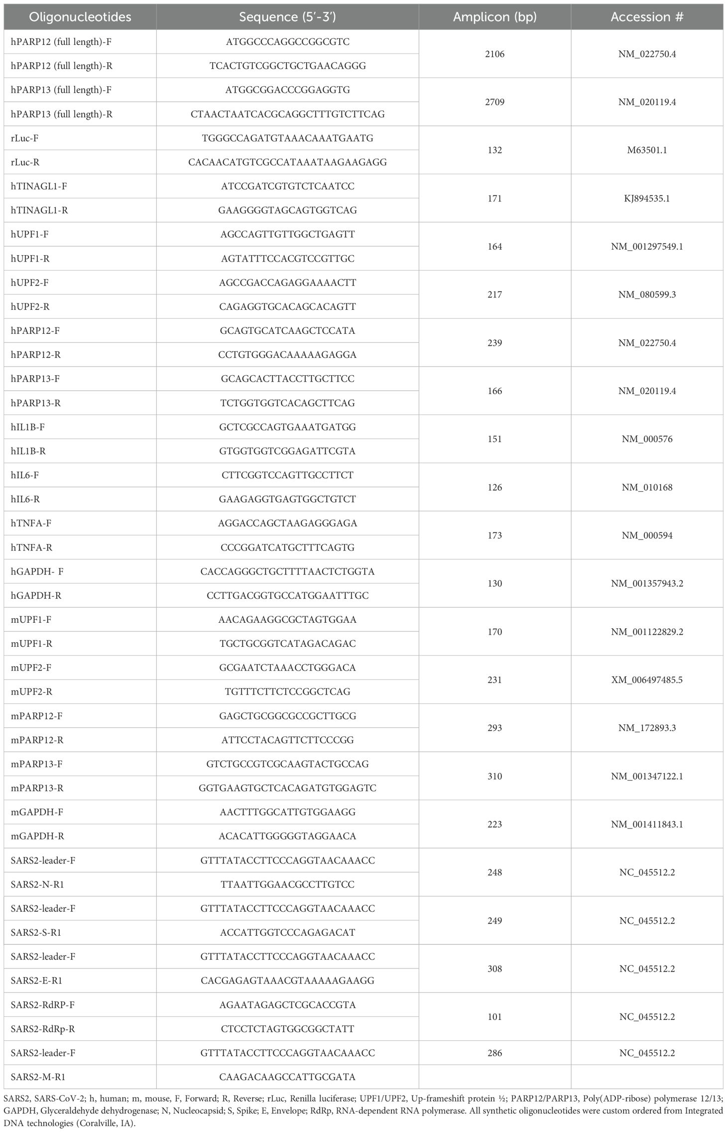 To monitor the synergy between PARP12/PARP13 and NMD factors, A549hACE2+ cells were seeded in 12-well plates (1 × 105 cells/well) and transfected in triplicate with siCtrl or UPF1- and UPF2-specific siRNAs (75 nM each) for 48 h and pCAGGS (1 μg) or PARP12 and PARP13 expression plasmids (0.02–1.0 μg each) for 24 h. Cells were then infected with SARS-CoV-2 (MOI: 0.1) for 24 h. Cells were analyzed in duplicate for SARS-CoV-2 subgenomic RNAs by RT-qPCR.