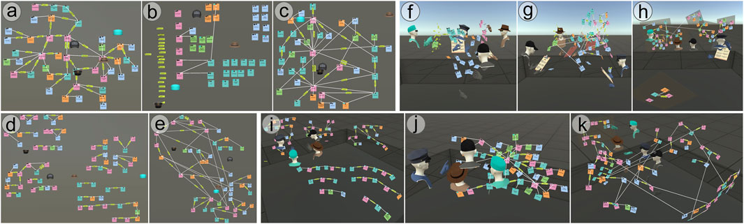 Figure 1. Setup of the desktop (a–e) and VR (f–k) conditions. Participants had 2D “hat” avatars on desktop and 3D embodied avatars in VR. Name tags were visible in the study (hidden here for anonymity). Communication was supported on desktop by video conferencing (omitted in the figure) and with headset mic/audio in VR. Individual images show mind maps created by study participants to solve crime puzzles. A variety of behaviours were observed across groups. For example, one group (G4) created all notes first and then sorted them by type before linking them to create the mind map, in both desktop (b,c) and VR (f,g). G3 initially created separate mind maps in VR (i) and also started with separate mind maps in the desktop condition but later merged them into one (e), while G2 created one mind map from the start in both conditions (a,j). G5 participants used 2D panels for different egocentric mind maps (h), and G8 participants used a 2D panel to keep “important” information (k).