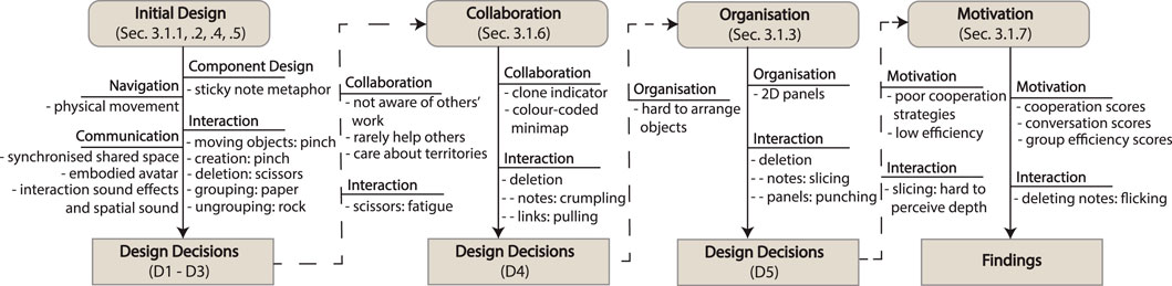 Figure 2. The iteration flow chart summarises the design decisions in each iteration for VR (the desktop system was changed accordingly with details in each section). The dashed lines indicate design decisions that were addressed in a subsequent iteration.