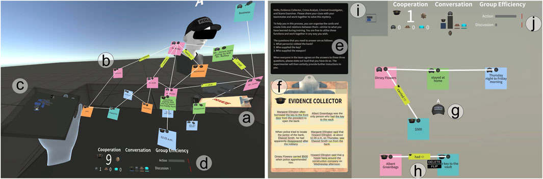 Figure 3. The VR (left) and desktop (right) mind-mapping system interfaces. The full view of the VR scene and the desktop canvas is not shown to save space. The Zoom windows that were used in the study for the desktop are omitted. (a) In VR, collaborator A’s clipboard hides the clues in other persons’ views. (b) Notes, links and link labels of the mind map. (c) The 3D minimap on the palm, where notes and links are coloured the same as the avatar (added in second iteration). (d) Gamification dashboard at waist height attached to the body (added in the fourth iteration). Users were represented by their role hats in the gamification dashboard. (e) Instruction board on desktop. (f) Clipboard with clues. (g) The “hat” avatar of collaborator A. (h) Buttons of a selected label. (i) Minimap with a coloured square (matching avatar colour) showing the current field of view relevant to the entire canvas (added in second iteration). (j) Gamification dashboard (added in fourth iteration).