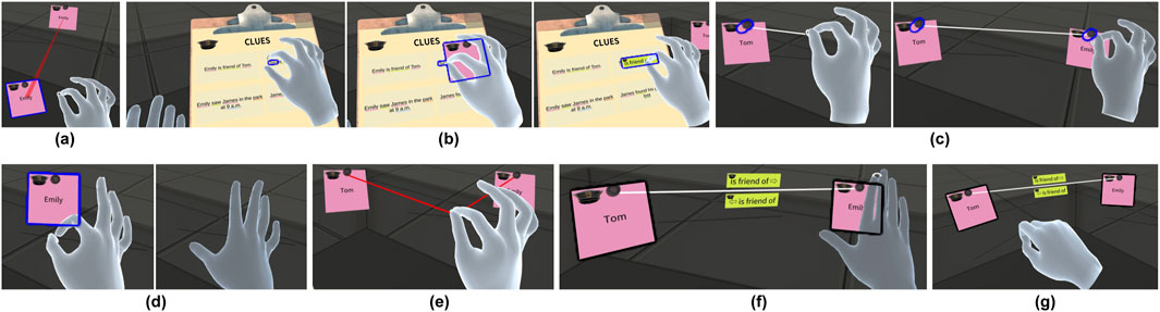 Hand gestures in VR enable natural interactions similar to those in the physical world, and have been shown to enhance presence and provide users a more realistic, satisfying and enjoyable experience compared to controllers (Voigt-Antons et al., 2020; Yeh et al., 2022; Laine and Suk, 2024). Following Piumsomboon et al. (2013), Huang et al. (2017) and Lee et al. (2021), we designed VR interactions for creation and manipulation using hand gestures (C1). A “pinch” gesture is used to grab notes and labels, create notes and labels from a clipboard (shown when the palm is up and flattened), and draw links between notes (see Figures 4a–c). We adopted a “flicking” gesture to delete notes and labels, and a “pulling” gesture to delete links (see Figures 4d,e). A “paper” gesture (open palm) is used to group notes, and a “rock” gesture (closed fist) is for ungrouping (see Figures 4f,g). We provide both visual (outline) and auditory feedback for the interactions.
