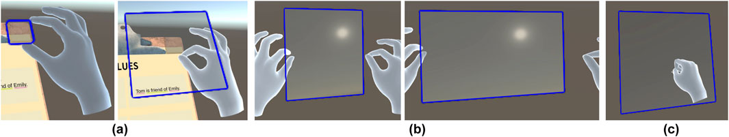 Figure 5. Panel creation and manipulation (third Iteration). (a) “Grab” a panel from the VR clipboard, (b) “pinch” with two hands to resize a panel, and (c) “punch” a panel to delete the panel.