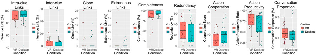 Figure 6. Boxplots of mind map analysis from left to right: intra-clue links, inter-clue links, clone links, extraneous links, completeness and redundancy, based on conditions; Boxplots of gamification measures from left to right: action cooperation scores, action productivity rate, and conversation proportion (same as conversation productivity here), based on conditions.