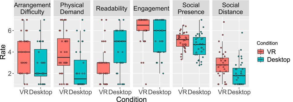 We also gathered participants’ subjective ratings (7-point Likert) on their experience of using the systems (Section 5.5). Questions were adapted from standard questionnaires of usability testing (Hart and Staveland, 1988; Harms and Biocca, 2004; Bailenson et al., 2003) and Social Presence (Harms and Biocca, 2004) and Distance (Bailenson et al., 2003) (see Supplementary Material S1 for the question list).