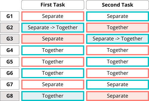 We used a within-subjects design, with two tasks conducted in VR and desktop respectively, as separate conditions. Condition and task order were counterbalanced across groups. We recruited four participants for each group.